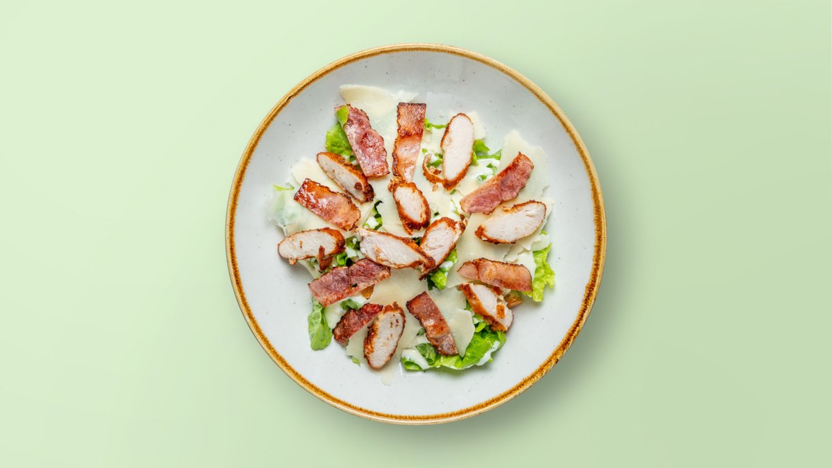 Sallatë jeshile, fileto pule e freskët, pancetë, bukë e thekur, parmigiano, salcë caesar,iceberg