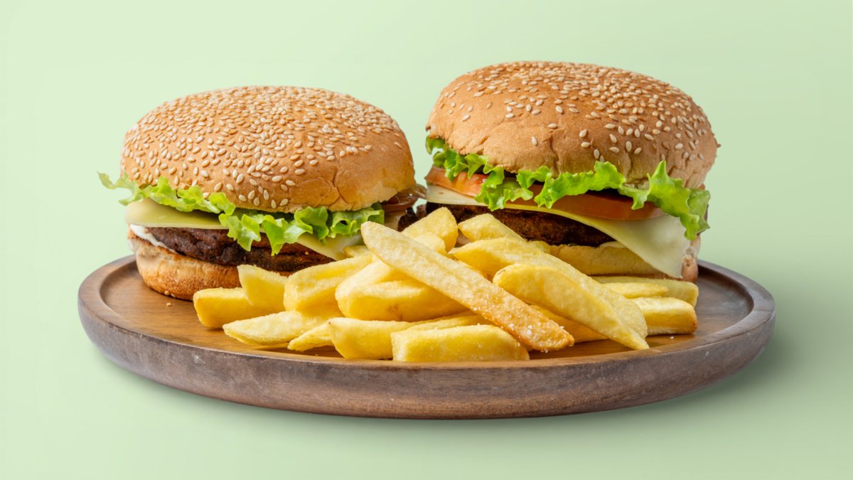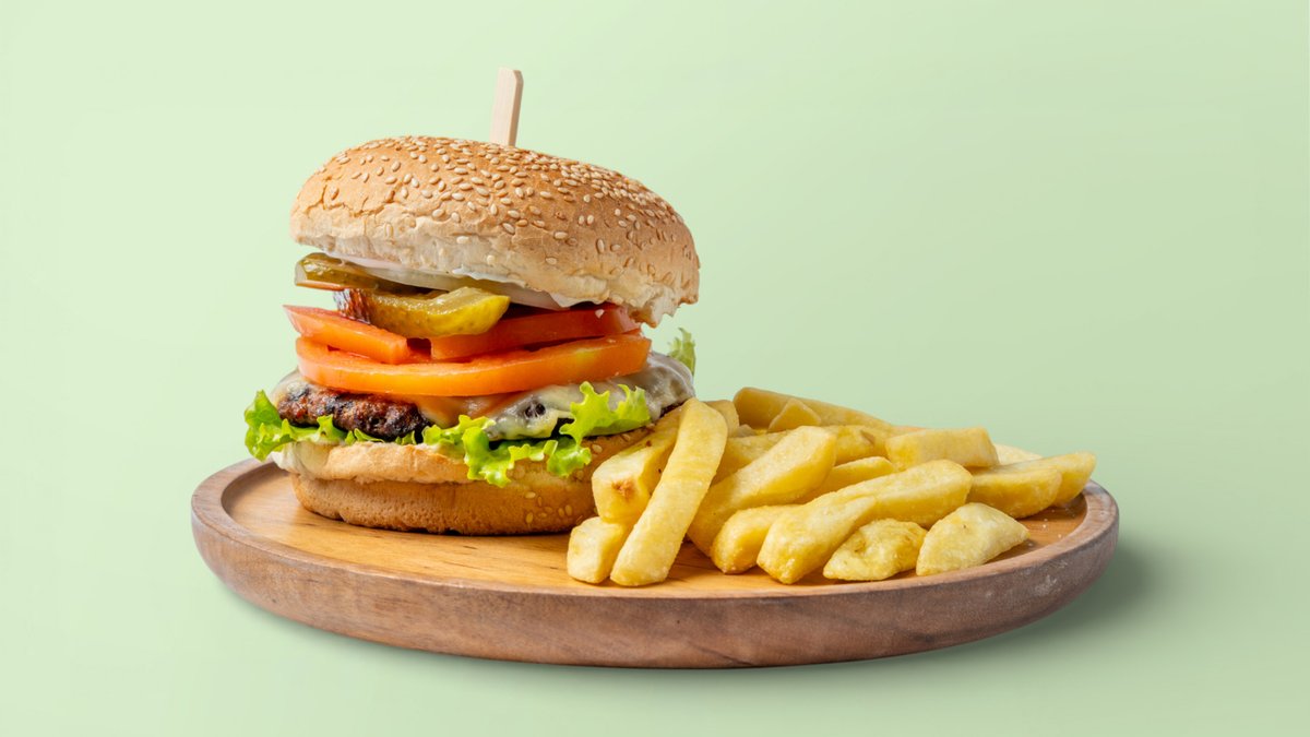 2 qofte, ketchup, salcë shef, djathë, domate e freskët, sallatë jeshile, patate