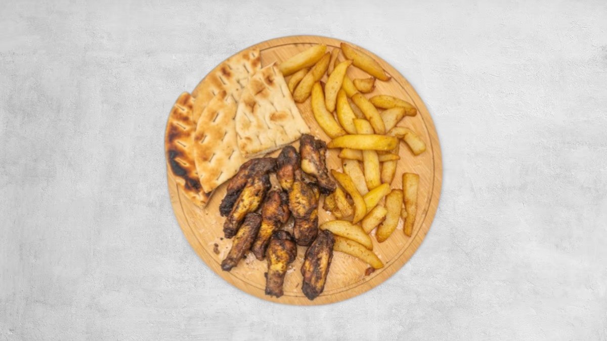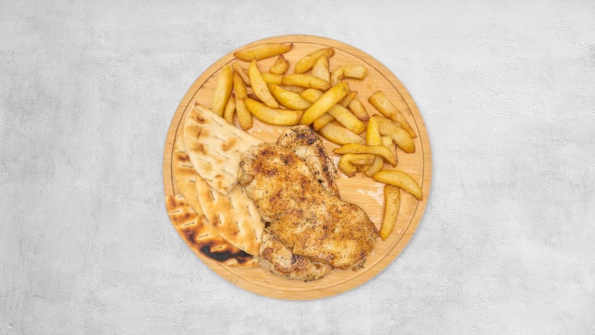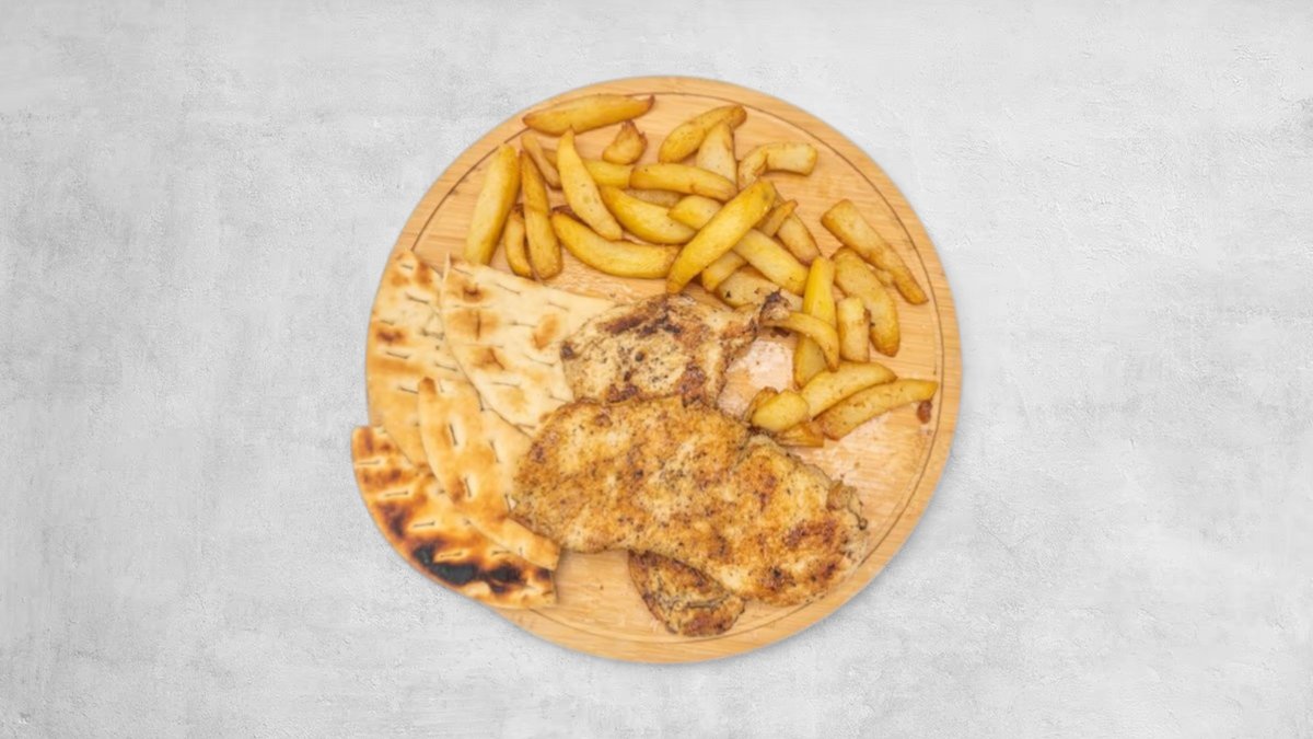 Kotoletë pule, sallatë jeshile, kastravec turshi, djathë cheddar, salcë burgeri, domate, patate