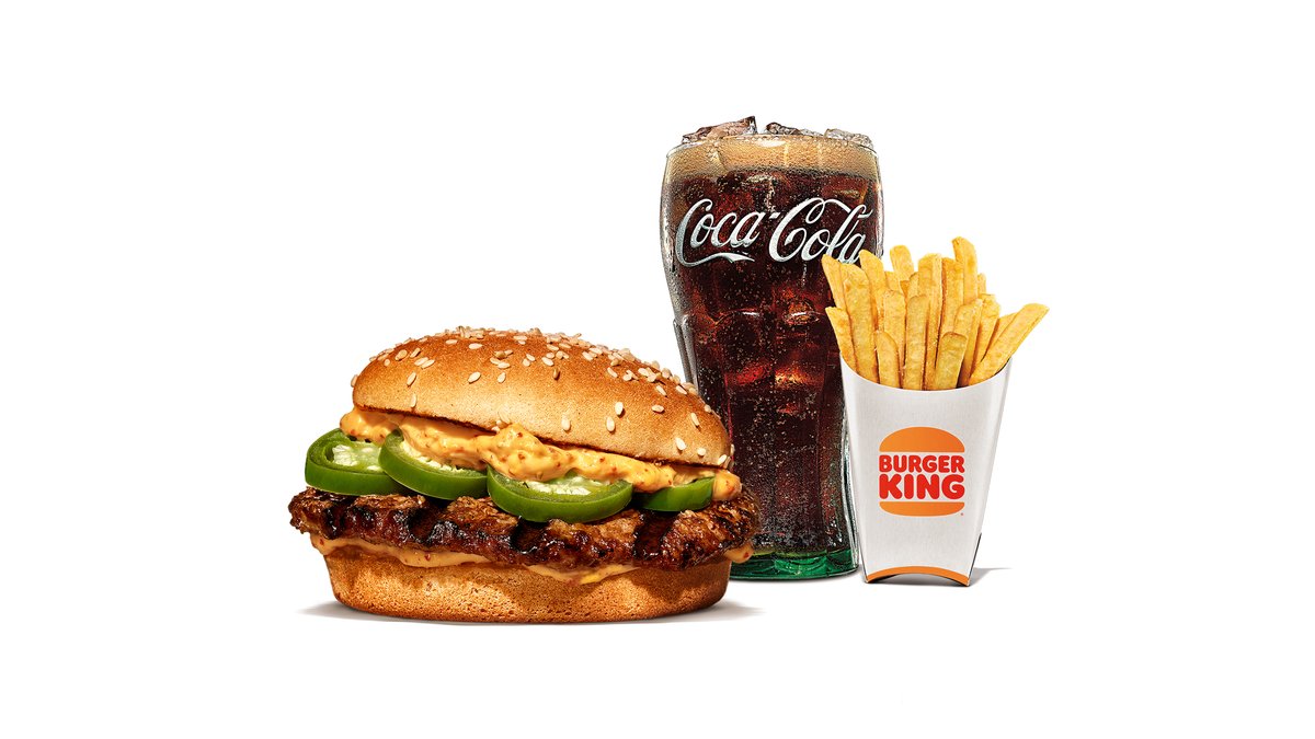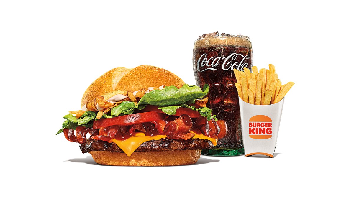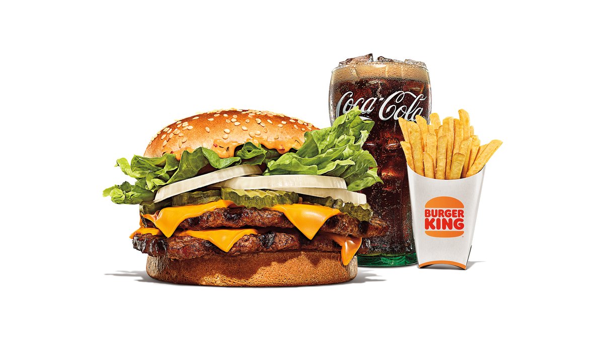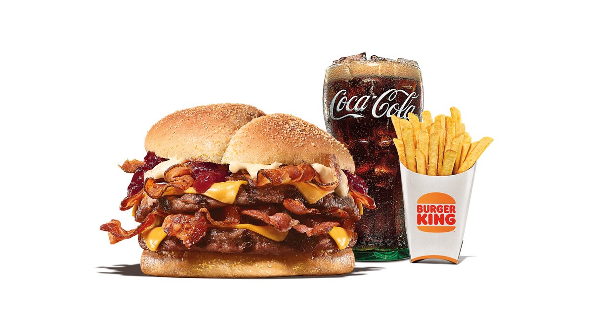 Majonezë, bacon, salcë barbeque, amerikan cheese, 3 whopper patty, patate e mesme, pije