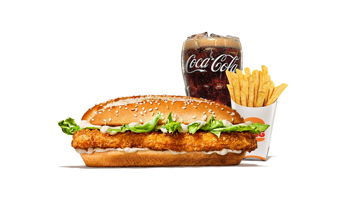Salcë chilli cheese, sallatë iceberg, domate, kastravec turshi, american cheese, fileto krokante, patate e mesme, pije