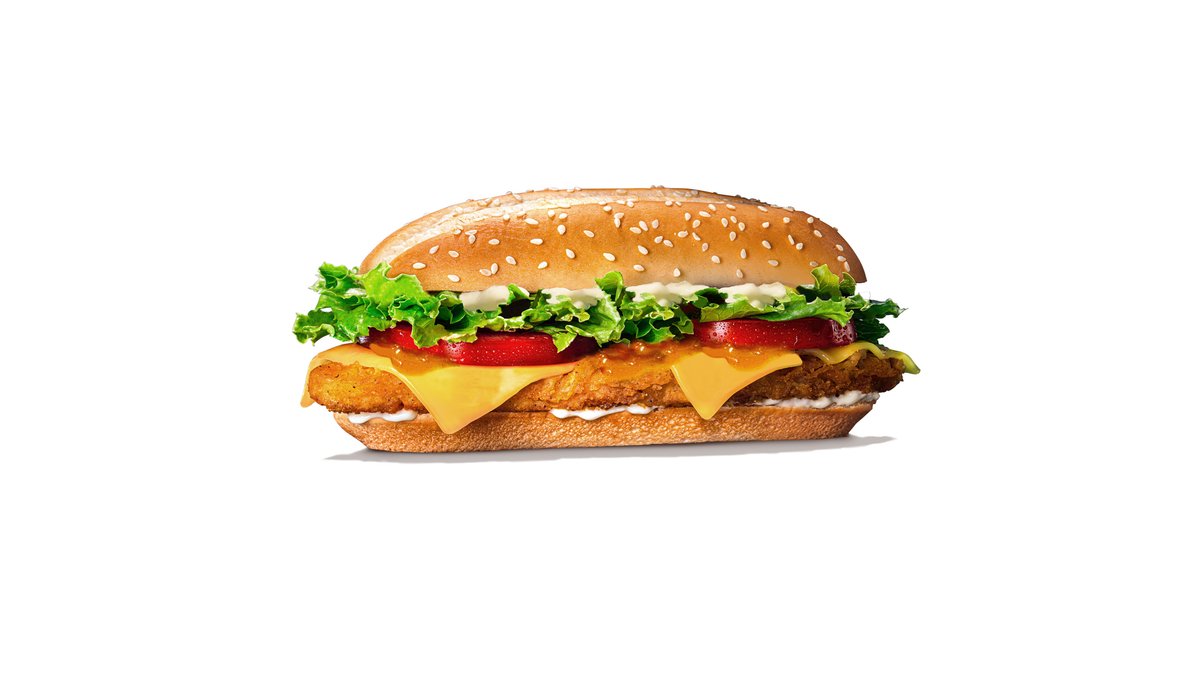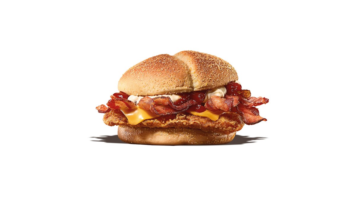 Sauce cheddar, onion, pickled cucumber, bacon, cheese slices, crunchy chicken patty