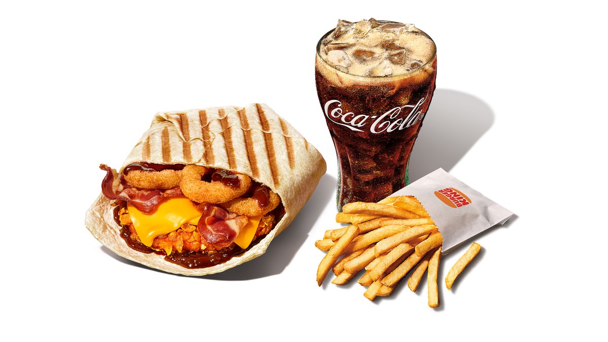 Majonezë, bacon, salcë barbeque, amerikan cheese, crunchy patty, patate e mesme, pije