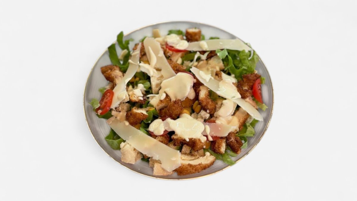 Copa pule krokante, sallat jeshile, buke e thekur, miser , pomodorini, grana, salce caesar