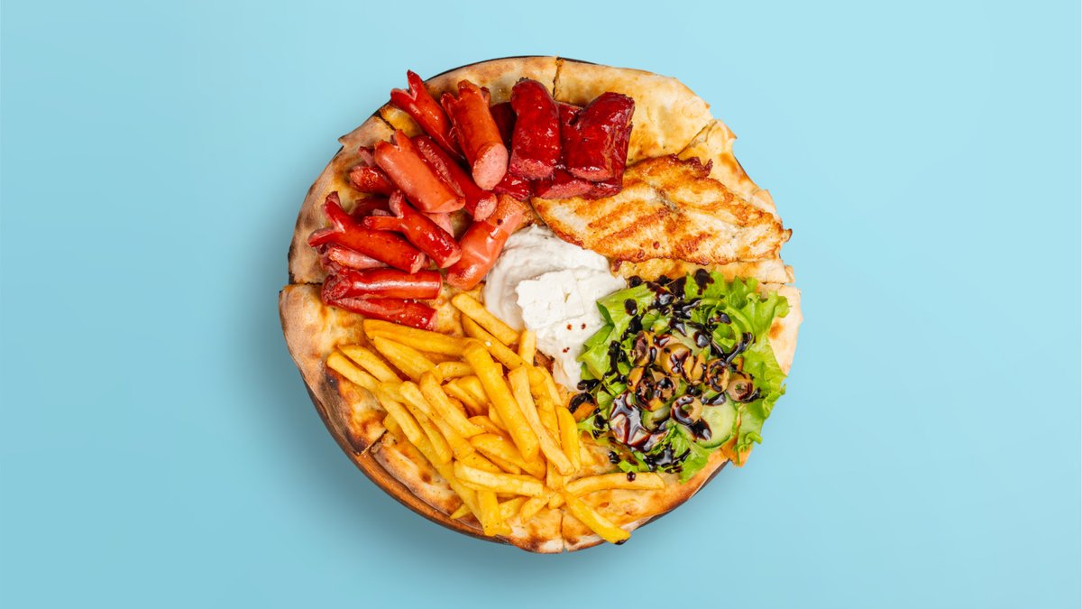 Kremviçe viçi, suxhuk, patate frite, domate, xaxiq, majonezë, mozzarella
