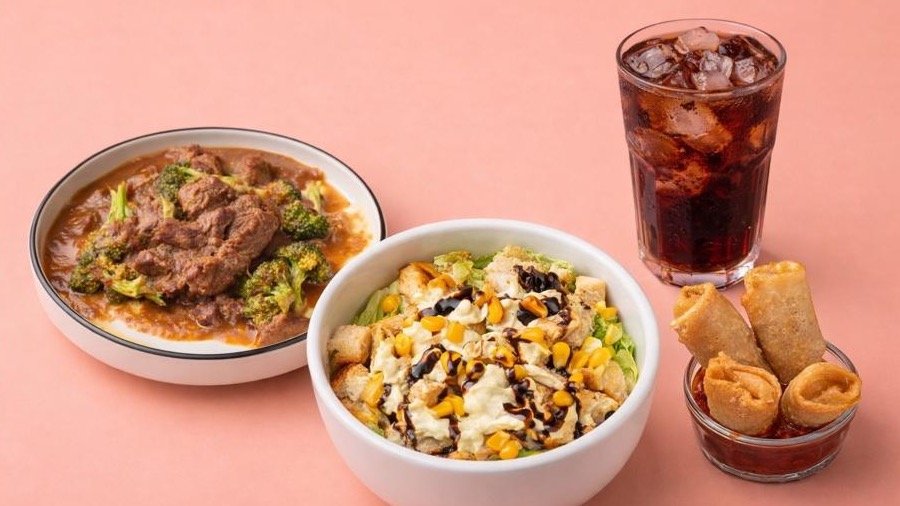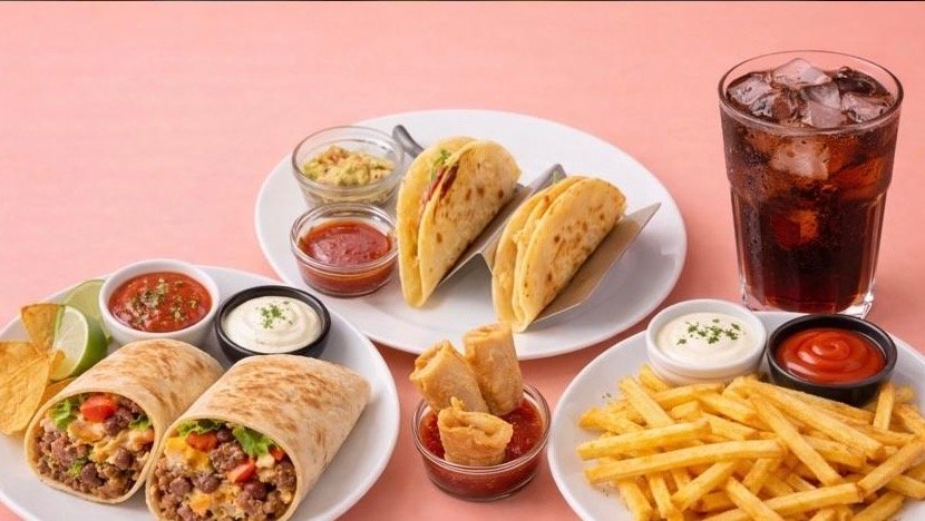 Rice, beef, onion, avocado sauce, mozzarella, spicy sauce, corn