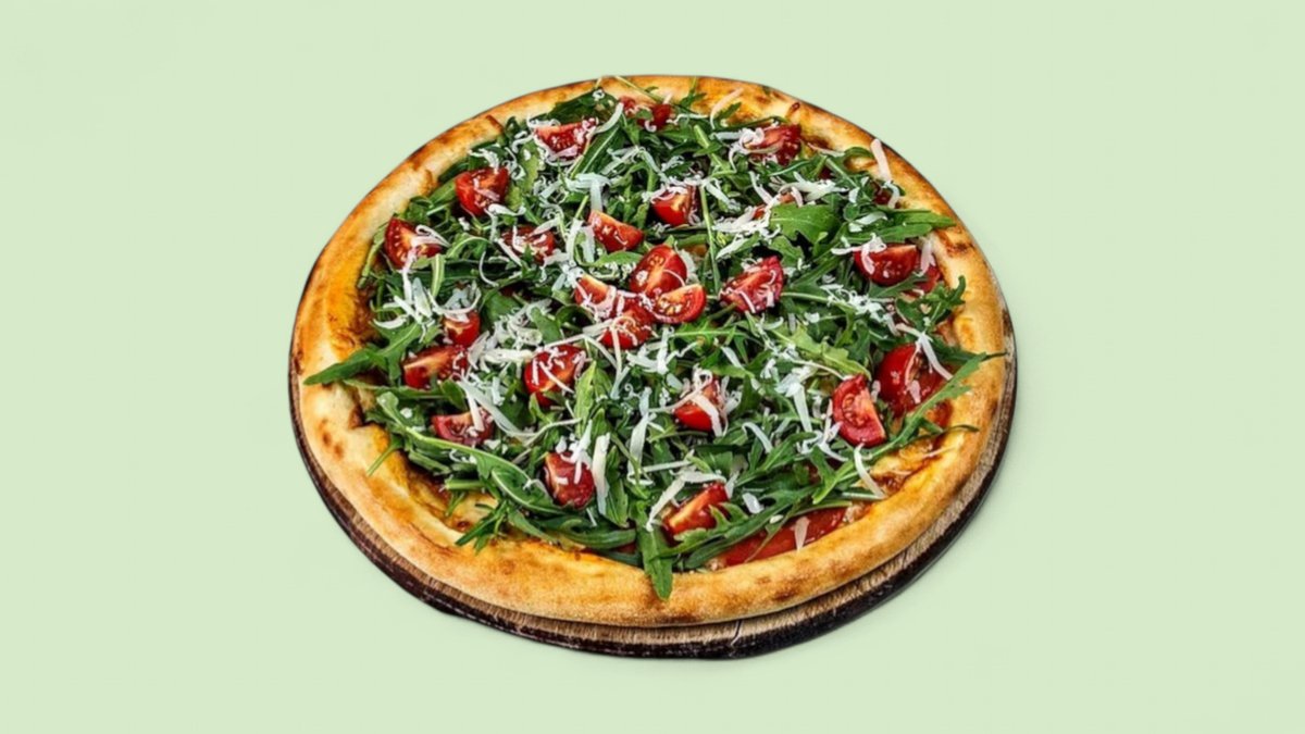 Sauce, mozzarella, parmigiano, arugula, pomodorini