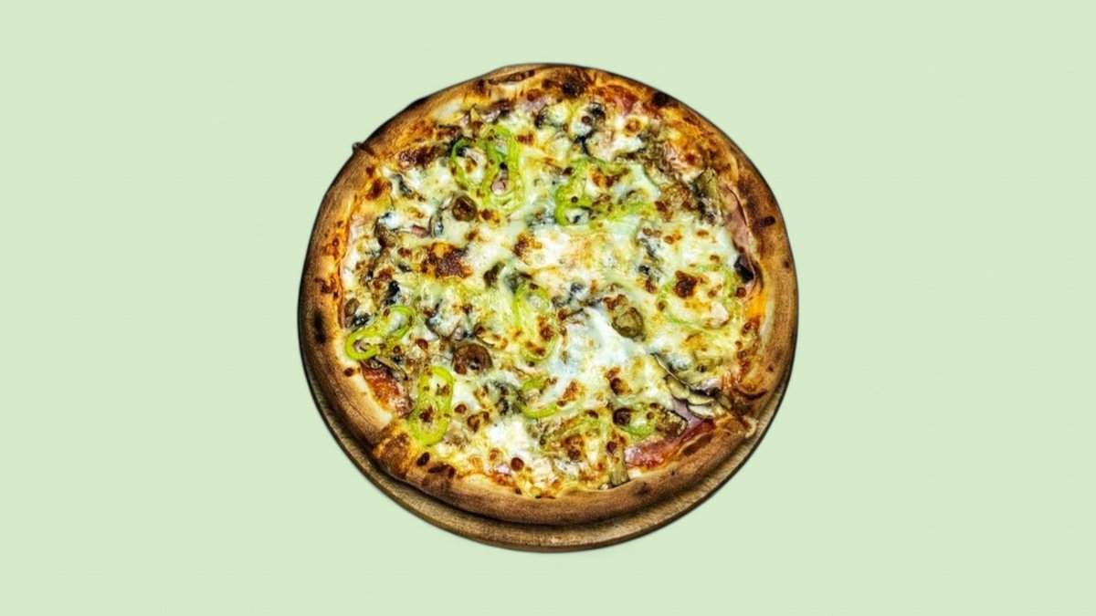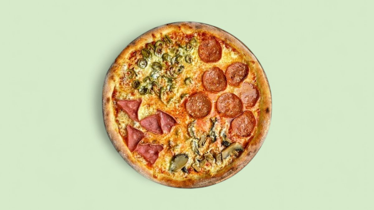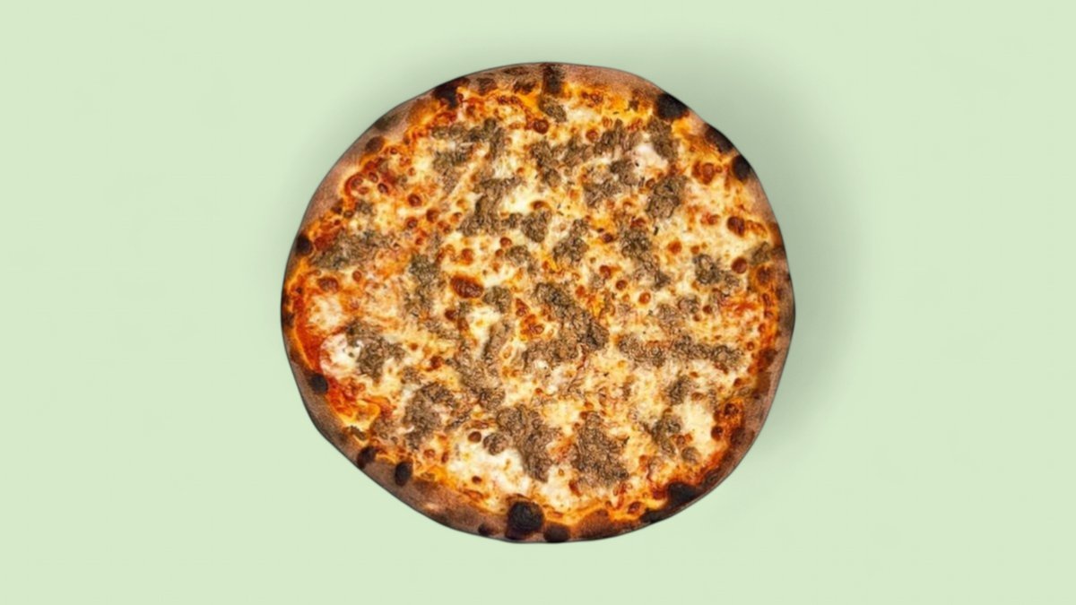 Sauce, mozzarella, spicy salami, ham, tuna, mushrooms