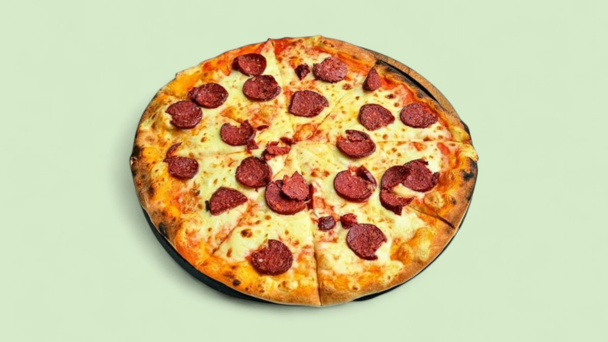 Sauce, mozzarella, spicy salami, mushrooms, olives