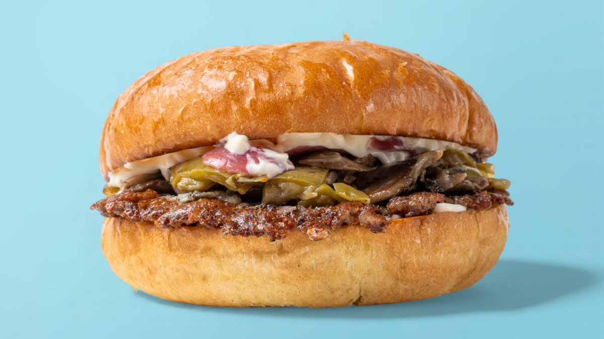 Smashed patty, potato bun, mushrooms, pickled red onion, green peppers, gorgonzola cheese, mayonnaise