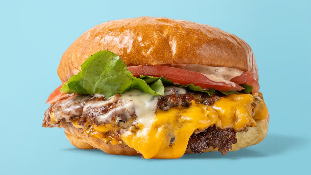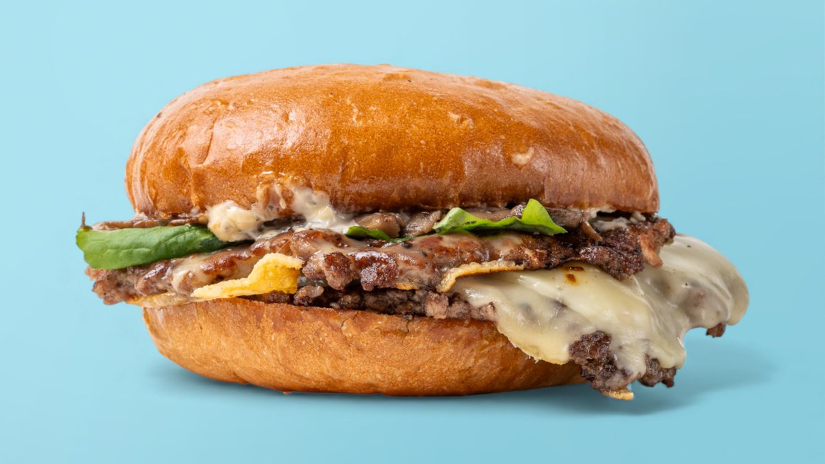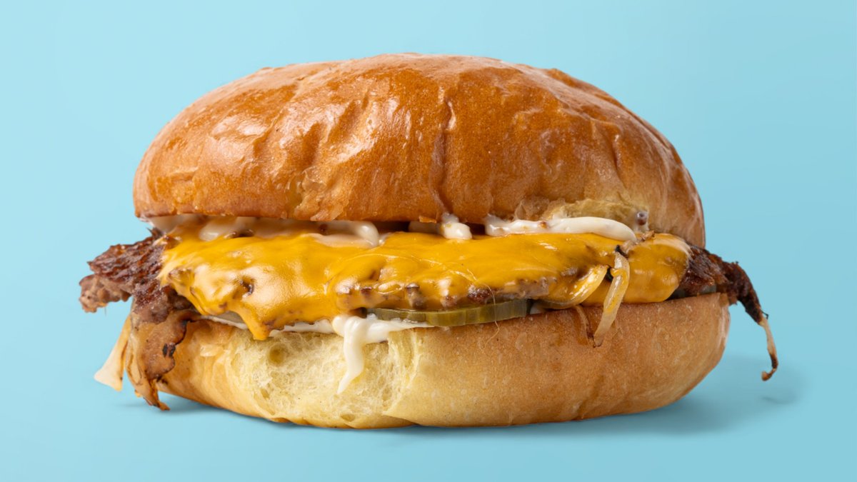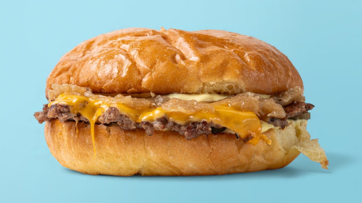 Smashed patty, potato bun, caramelized onions, cheddar cheese, pickles, mustard