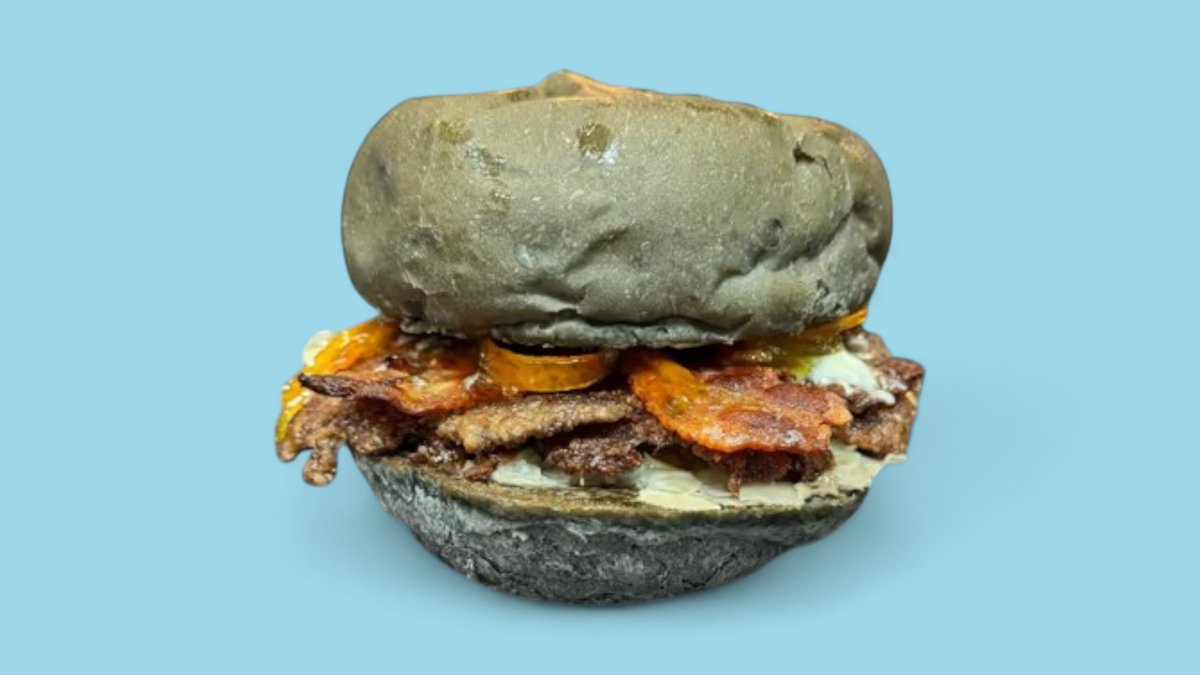 x2 Smashed patties, charcoal potato bun, bacon, gorgonzola , caramelized onions in champagne, orange jam, black garlic mayo
