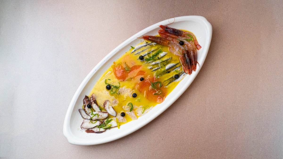 Mixed leaves, iceberg, pomodorini orange, avocado, shrimp, octopus, almonds