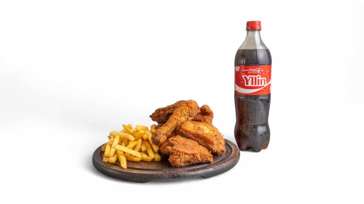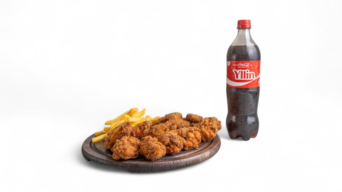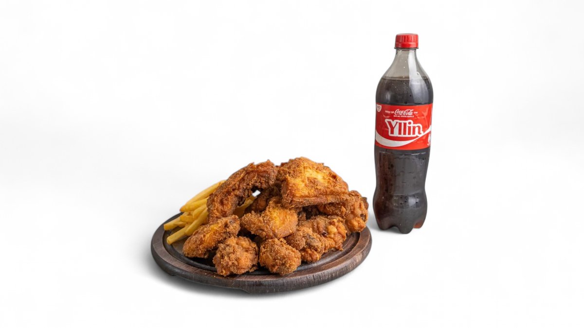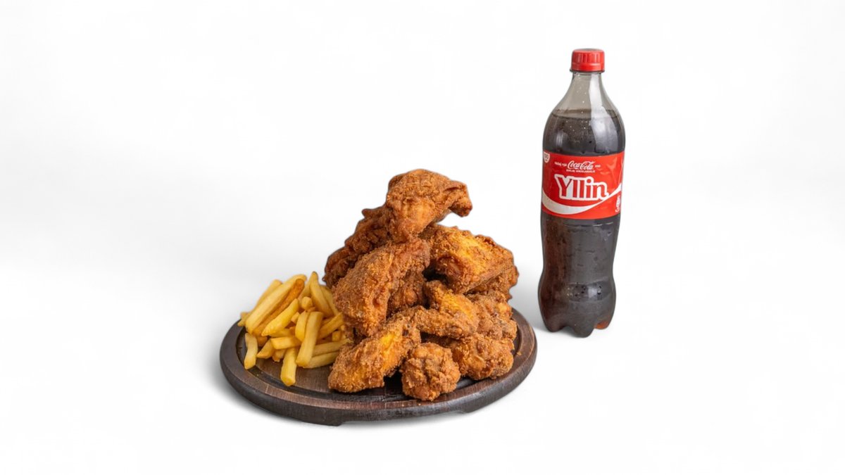 6 Pieces of chicken, 12 wings, 3 potatoes, 1 family coca cola