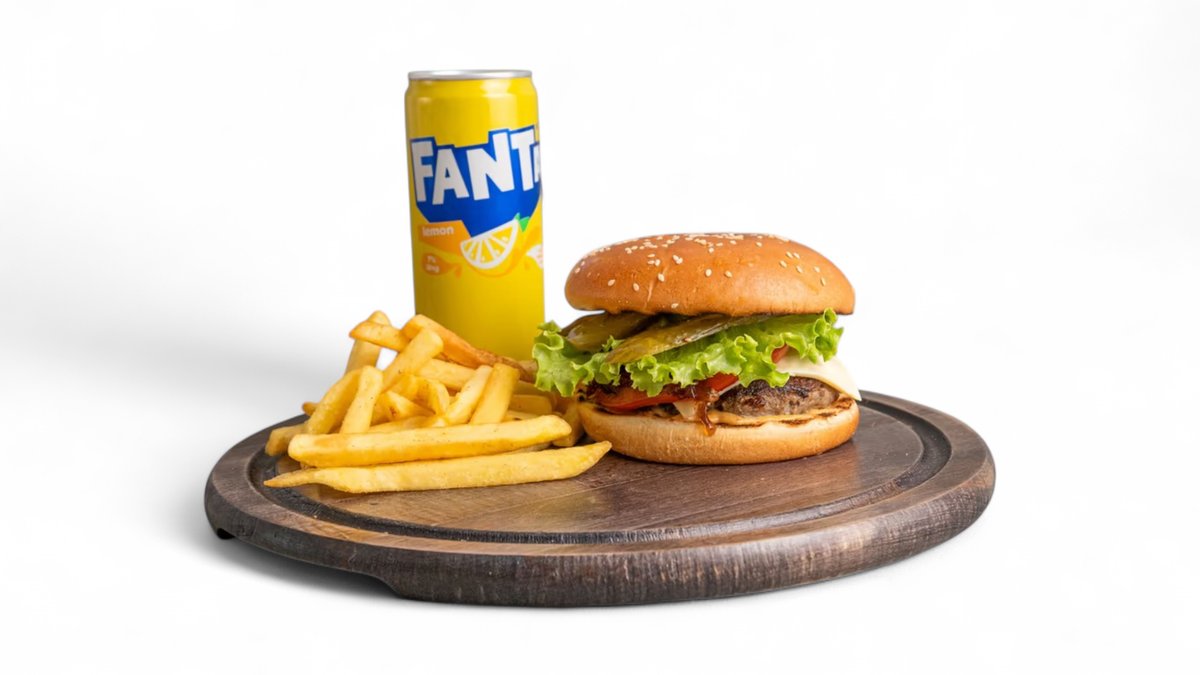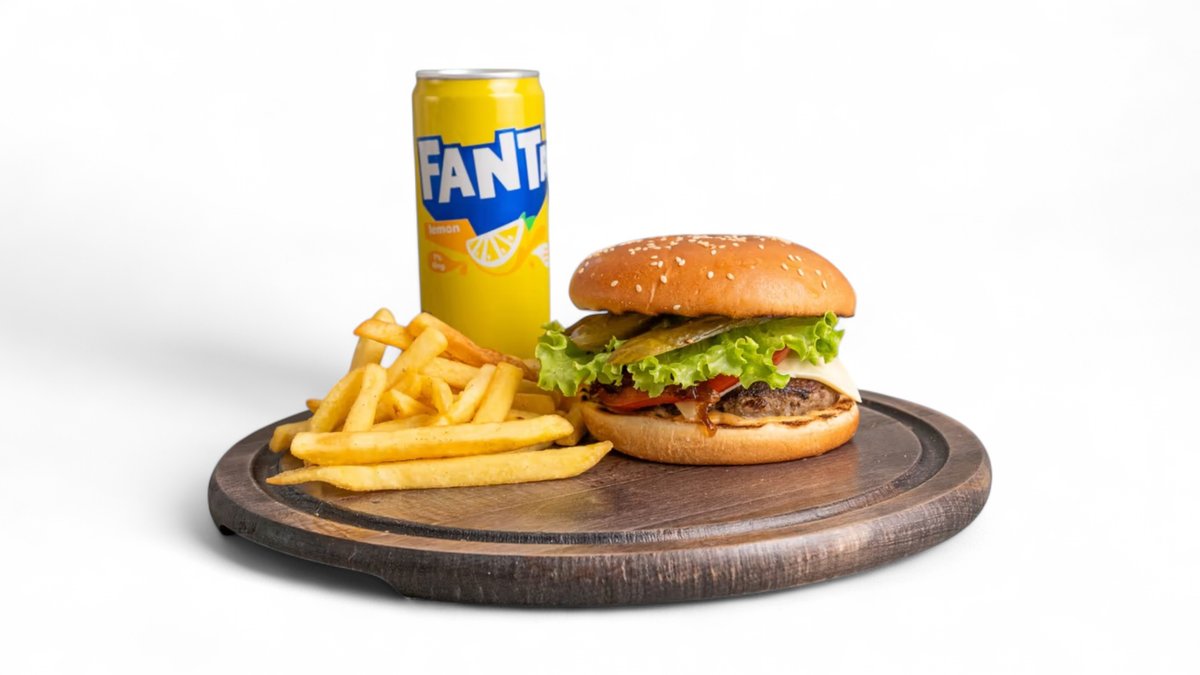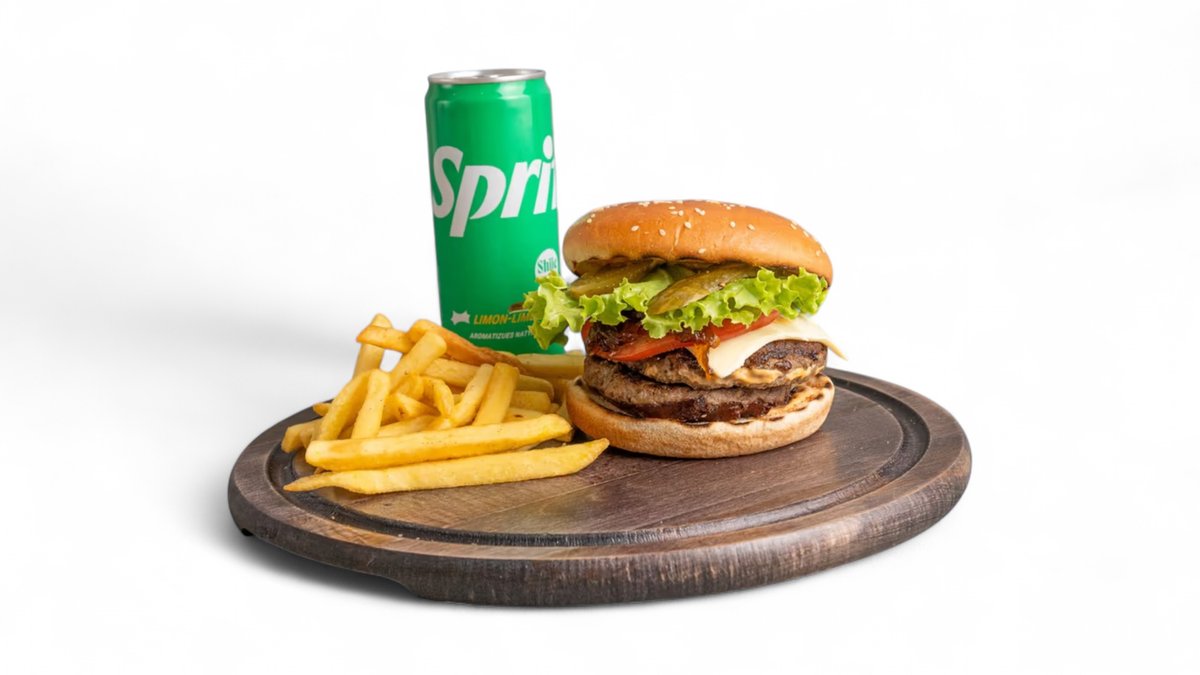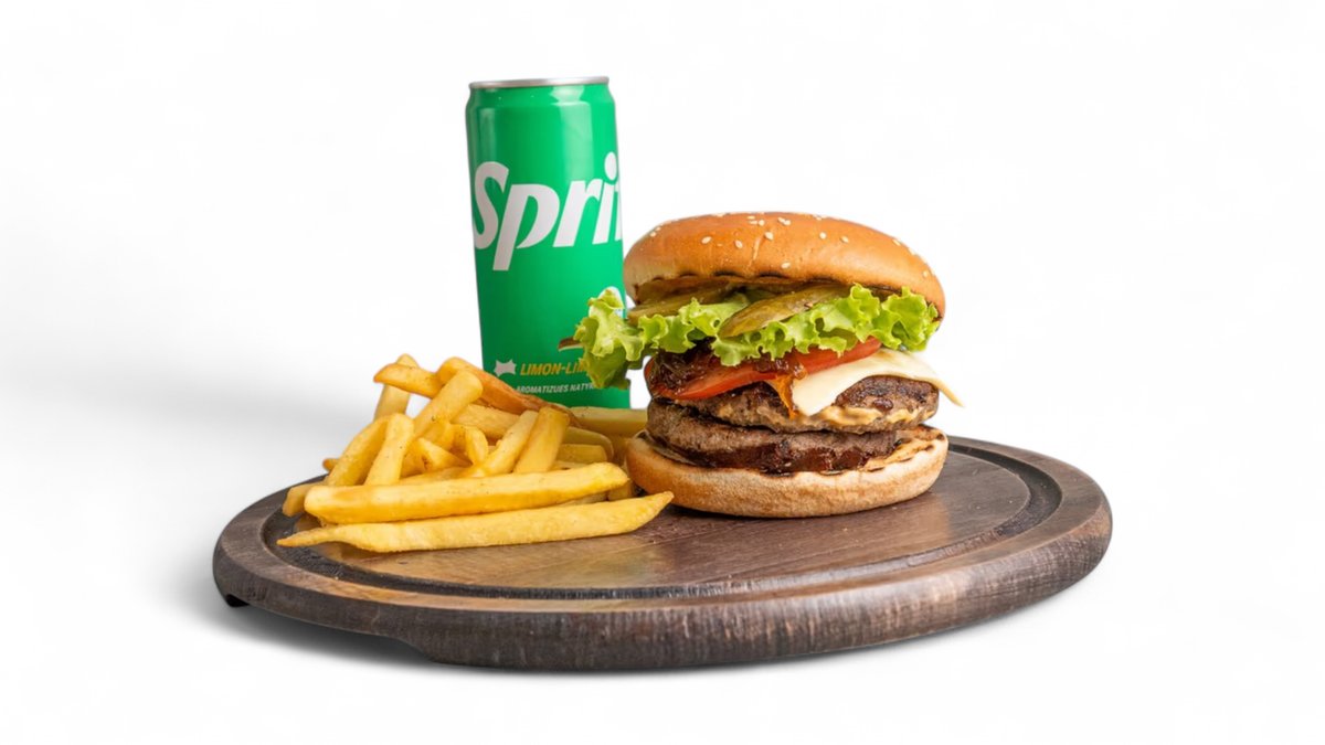 Double beef burger, 2 wings or 1 drumstick, chips, drink