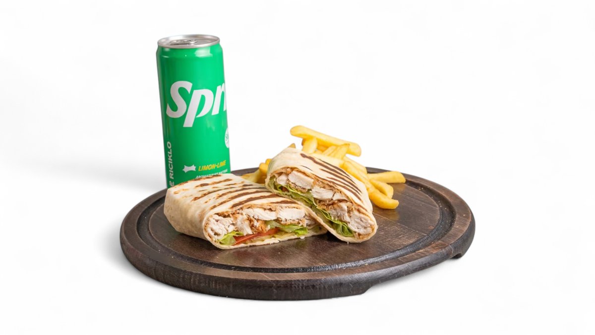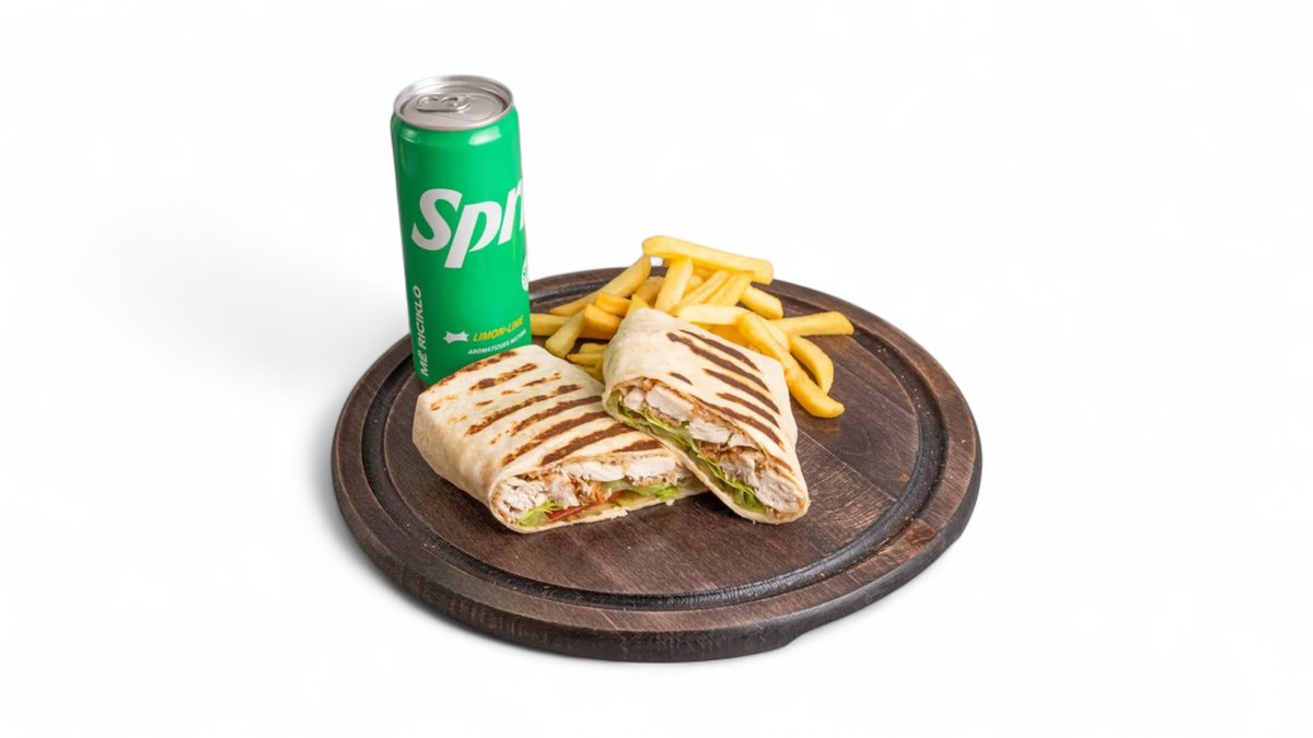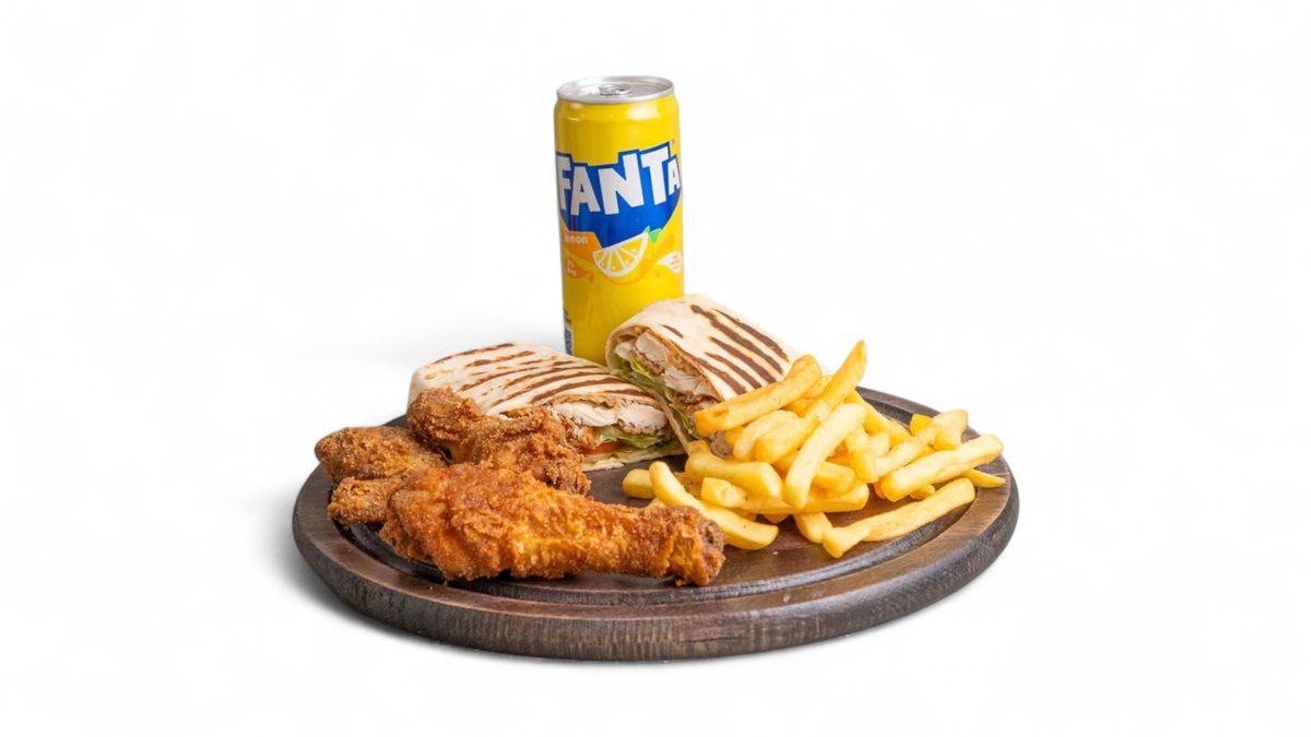 Fillet wrap, 2 wings or 1 drumstick, chips, drink