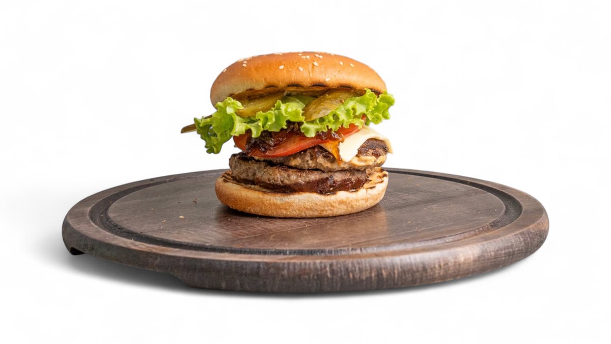 2 X beef, cheese, cucumber, pickles, tomatoes, onions, lettuce, mayonnaise, burger sauce
