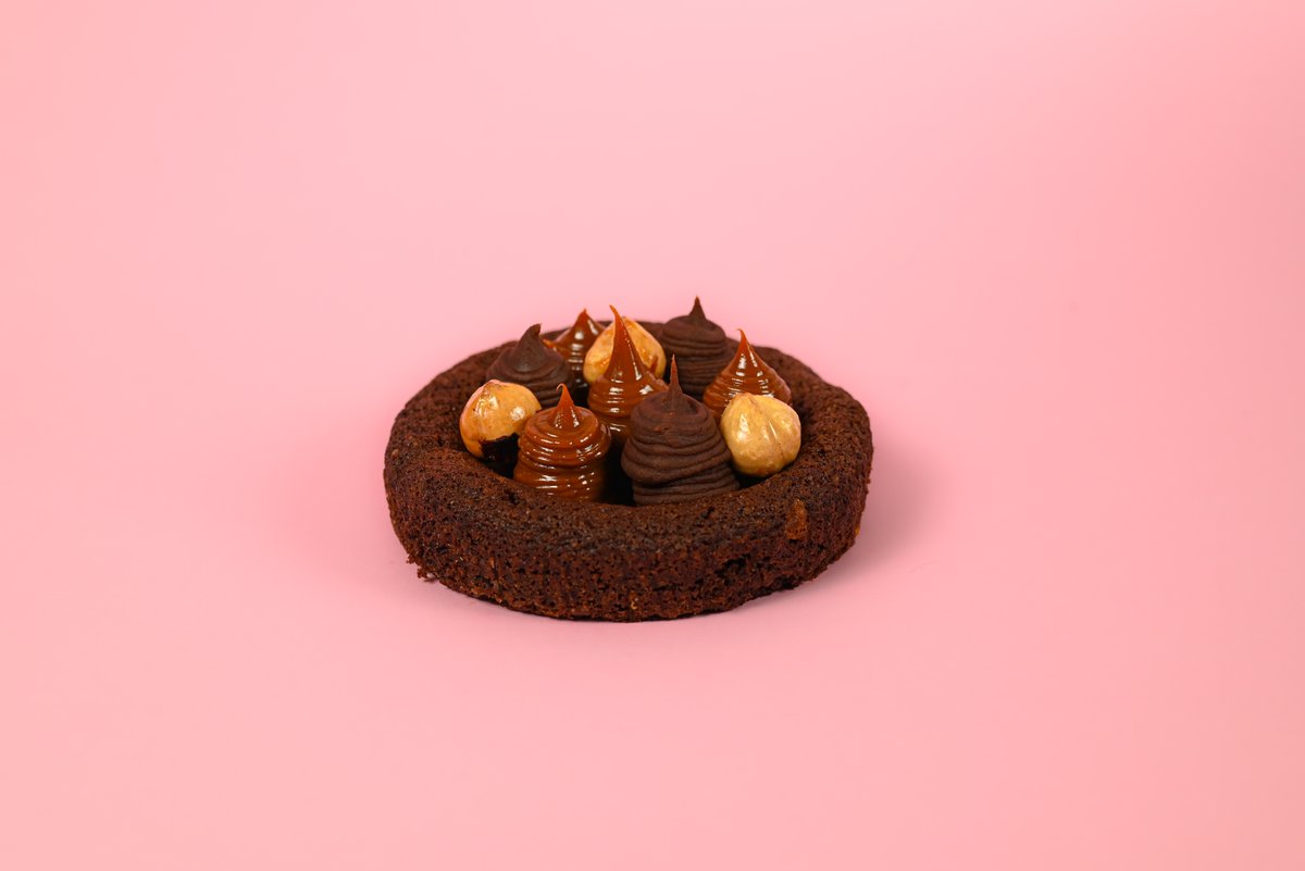 Me ganache çokollate, dulce de leche dhe lajthi të karamelizuara. Cookie brownie me çokollatë të pasur, dulce de leche dhe lajthi të karamelizuara. E butë dhe intensive në shije.