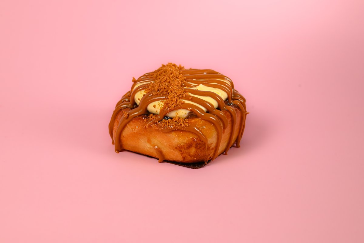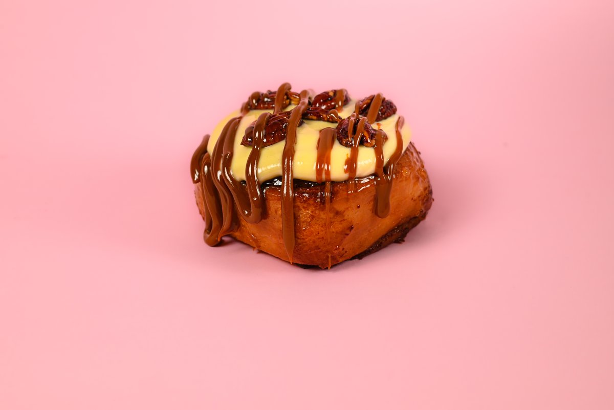 Cinnamon roll me arra pekan krokante dhe dulce de leche kremoz, i pasur dhe i balancuar ne shije.