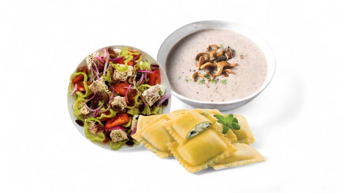 Ravioli spinaq , sallatë fshati & supe kerpudhe