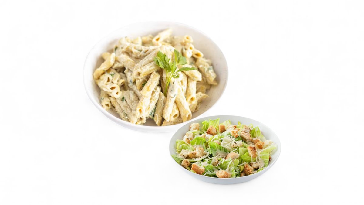 Penne fileto pule (kërpudhë, pana) & Sallatë Caesar