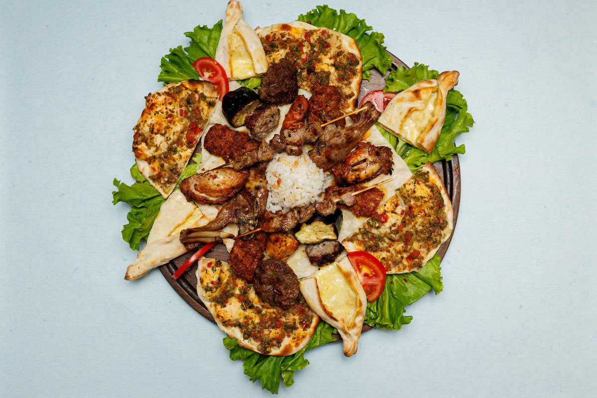 Qebap adana ose urfa, shish pule, krahë pule, kebab me patëllxhan, qofte, shish qengji, brinjë qengji, lahmacun mini, pide mini, pilaf, shërbehet me domate dhe speca të pjekura