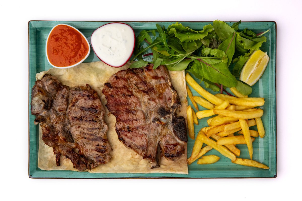 Marinuar në vaj ulliri dhe kripë, shërbehet me dy lloje salcash, patate të skuqura dhe sallatë të përzier