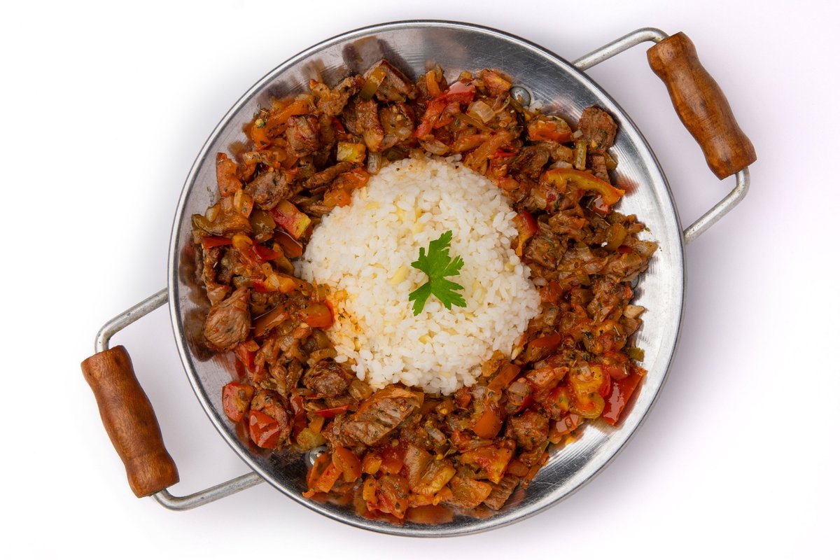 Mish i prerë në copa të vogla, gatuhet me domate, speca të kuq dhe speca jeshille, qepë dhe erëza, shërbehet me pilaf