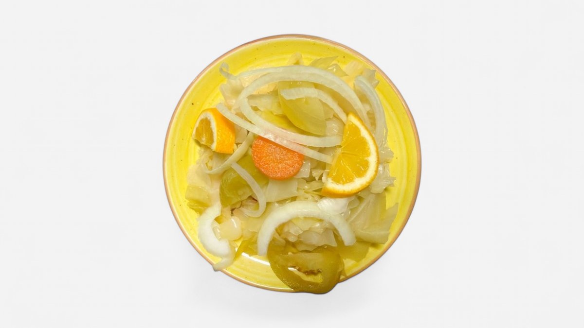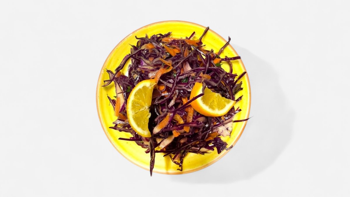 Beets, cabbage, potatoes, sauce, 1 chicken breast, 2 meatballs