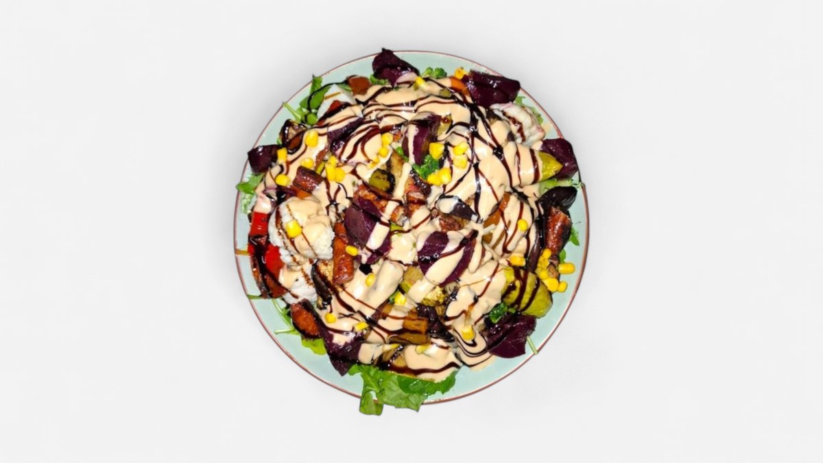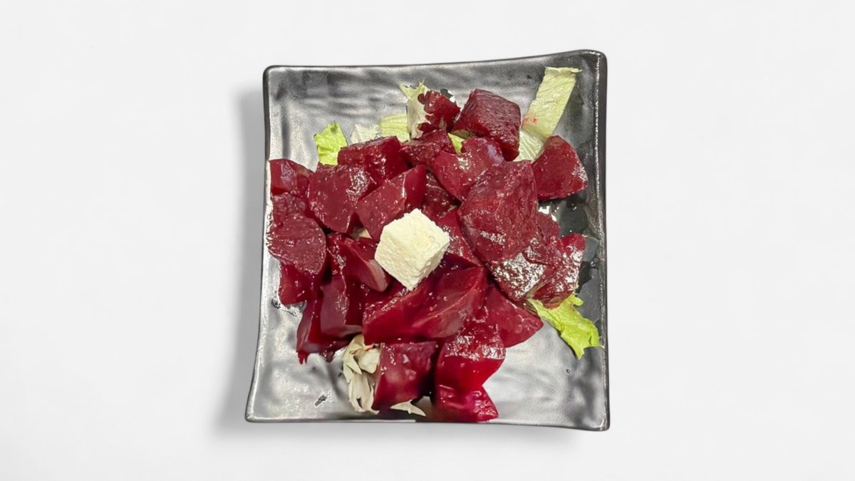 4 Meatballs, 2 beef shishkebab, potatoes, greek salad, buttermilk beet pie