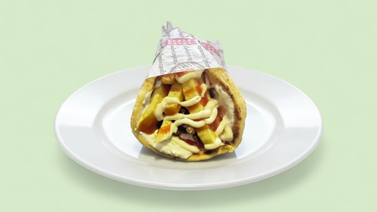 Pork shish kebab, tomato, lettuce, sour cream, mayonnaise, ketchup