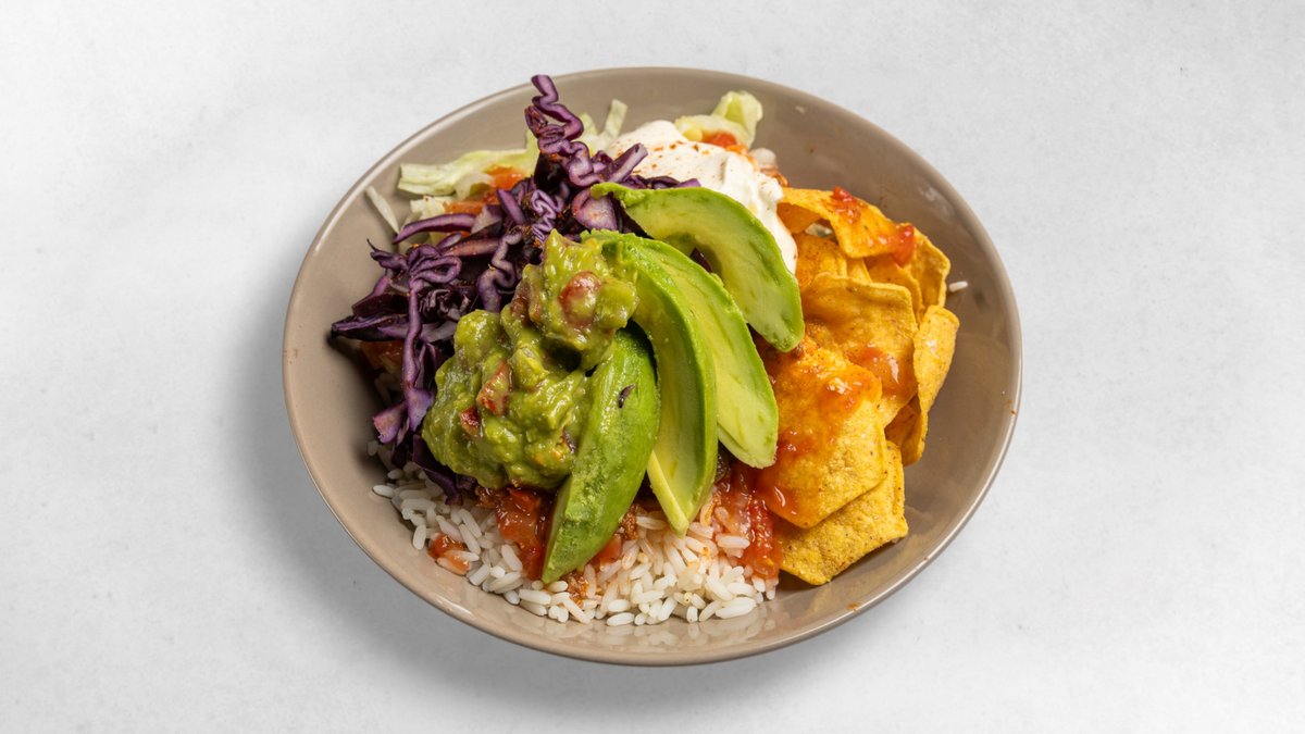 Frische grüne Avocadoscheiben, knusprige Tortilla-Chips, Limettenreis und mexikanische Tomatensalsa, schwarze Bohnen, frischer Eisberg, Creme fraiche und eingelegter Rotkohl