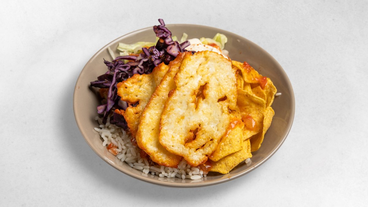 Gegrillter Seiden-Halloumi, knusprige Tortilla-Chips, Limettenreis und mexikanische Tomatensalsa, schwarze Bohnen, Crème fraîche, frischer Eisberg und eingelegter Rotkohl