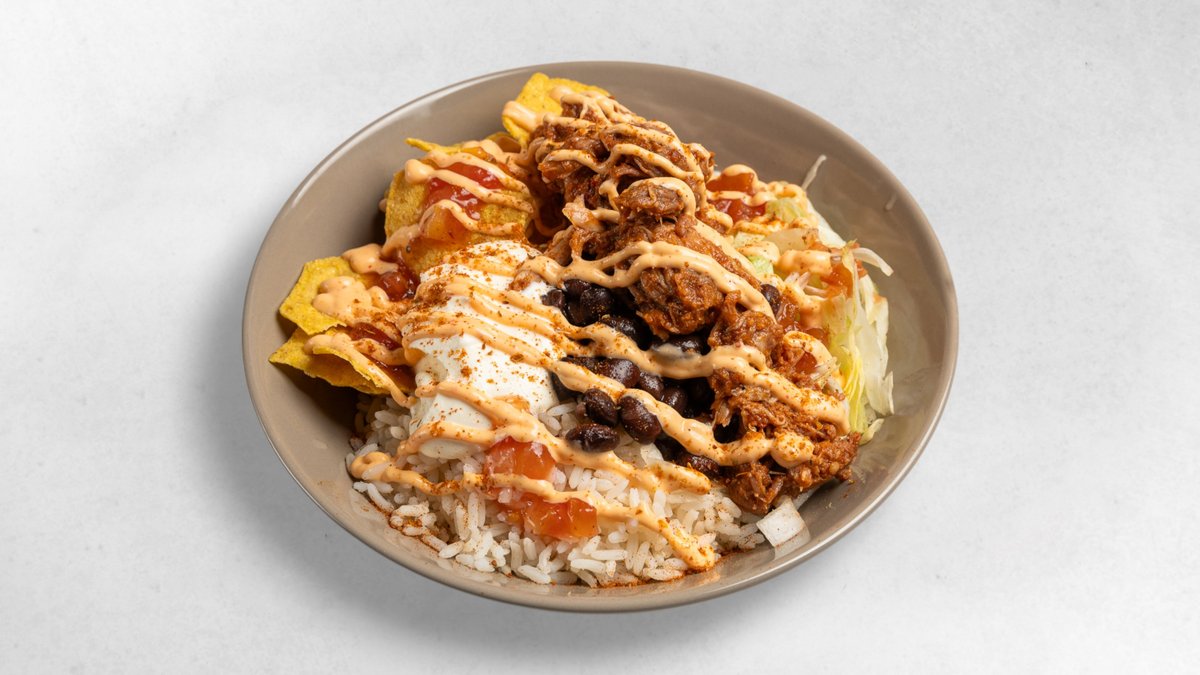 Pulled Pork in milden mexikanischen Gewürzen, knusprige Tortilla-Chips, Limettenreis und mexikanische Tomatensalsa, schwarze Bohnen, frischer Eisberg, Crème fraîche und cremige Chipotle-Salsa zum Beträufeln