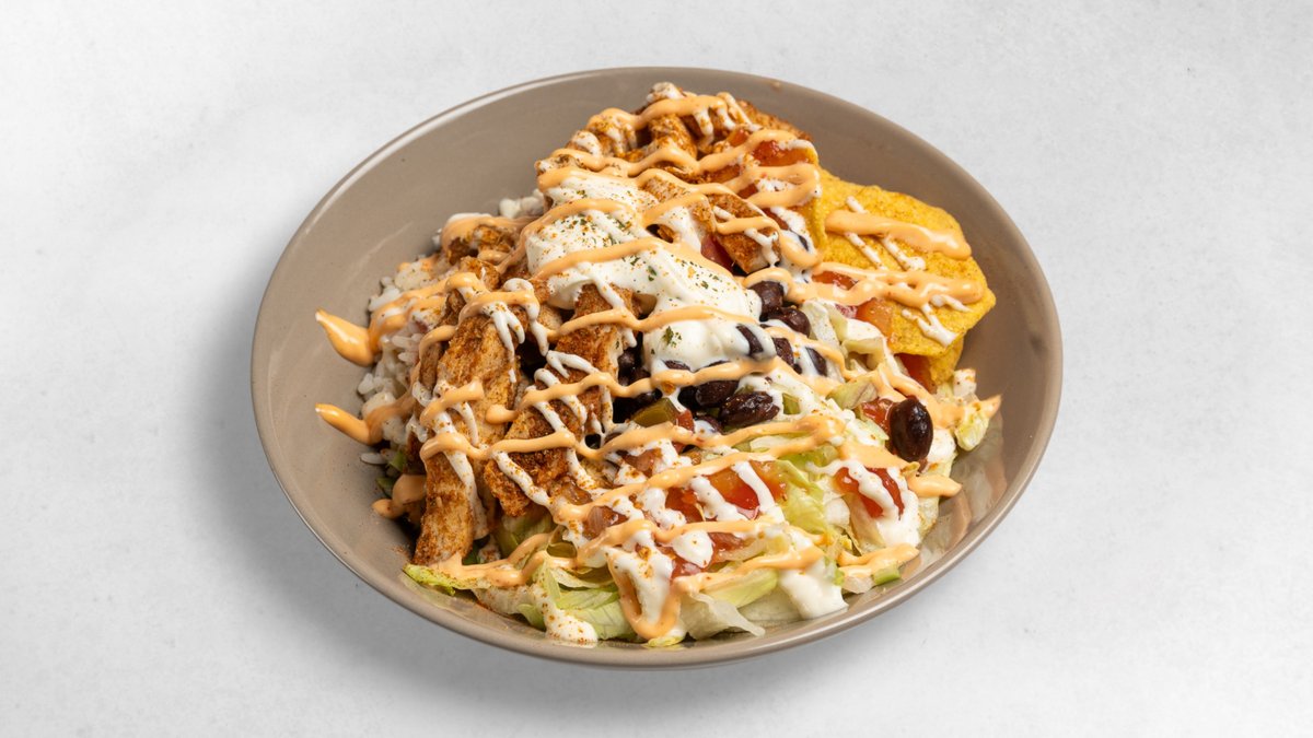 Saftig gegrillte, fajita-marinierte Hähnchenbrust, knusprige Tortilla-Chips, Limettenreis und mexikanische Tomatensalsa, schwarze Bohnen, frischer Eisberg, Crème fraîche und cremige Chipotle-Salsa zum Beträufeln