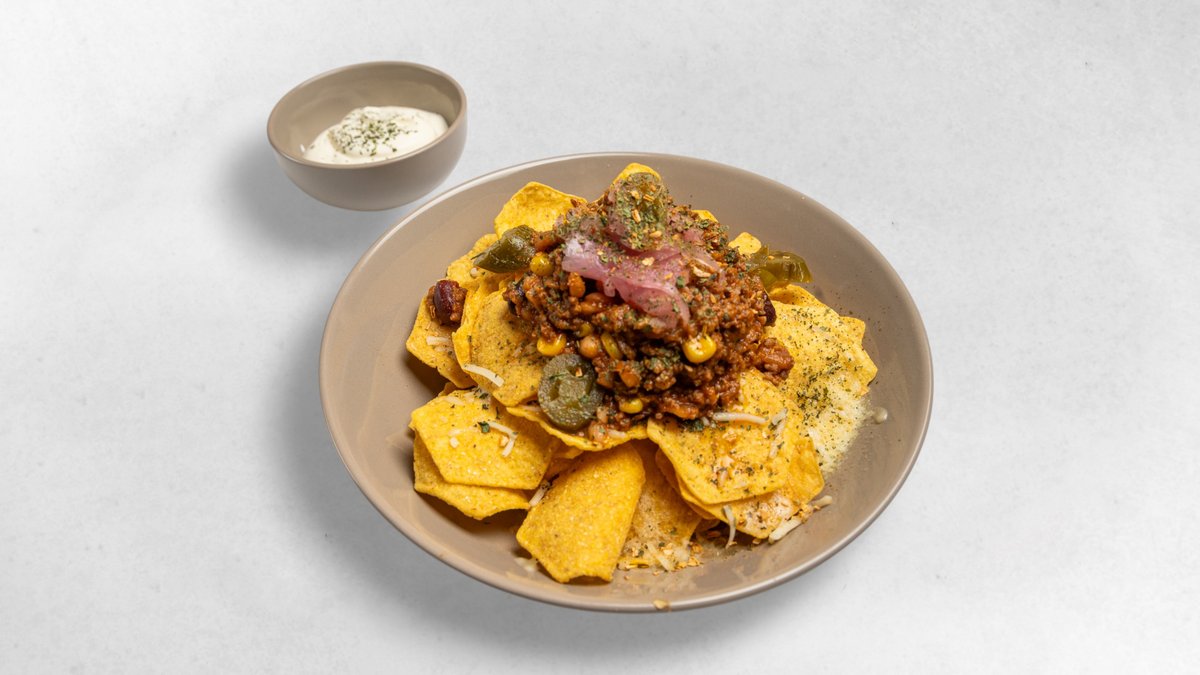 Unsere knusprigen Tortilla-Chips mit mexikanisch gewürztem Chili con Carne, geschmolzenem Cheddar-Käse-Mix, Creme Fraiche und Frühlingszwiebeln