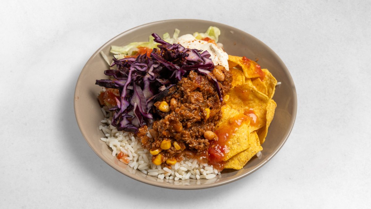 Mexikanisch gewürztes Chili con Carne, knusprige Tortilla-Chips, Limettenreis und mexikanische Tomatensalsa, schwarze Bohnen, frischer Eisberg, Crème fraîche und eingelegter Rotkohl