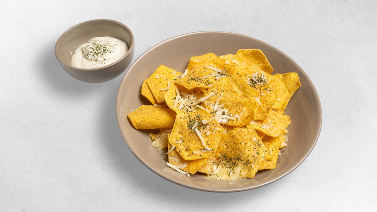 Unsere knusprigen Tortilla-Chips mit geschmolzenem Cheddar-Käse, Crème fraîche und Frühlingszwiebeln