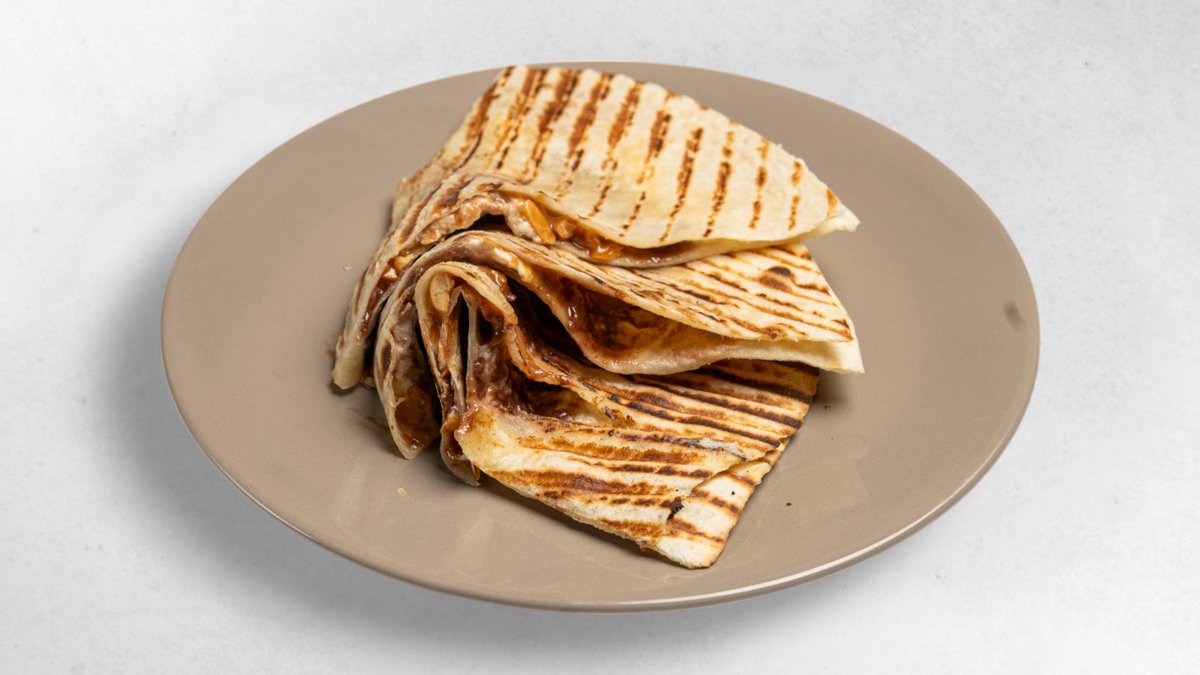 Gegrillte Weizentortilla mit Pulled Pork in milden mexikanischen Gewürzen, Crème fraîche und Cheddar-Käse-Mix