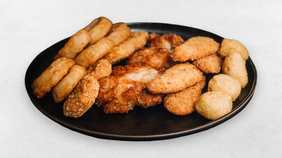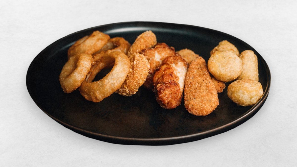 4x Chilli Cheese Nuggets, 4x mini smoky Cheese Donuts, 4x crispy Chicken Strips, 4x crispy Chicken Wings, 6x Onion Rings, 3x Ketchup