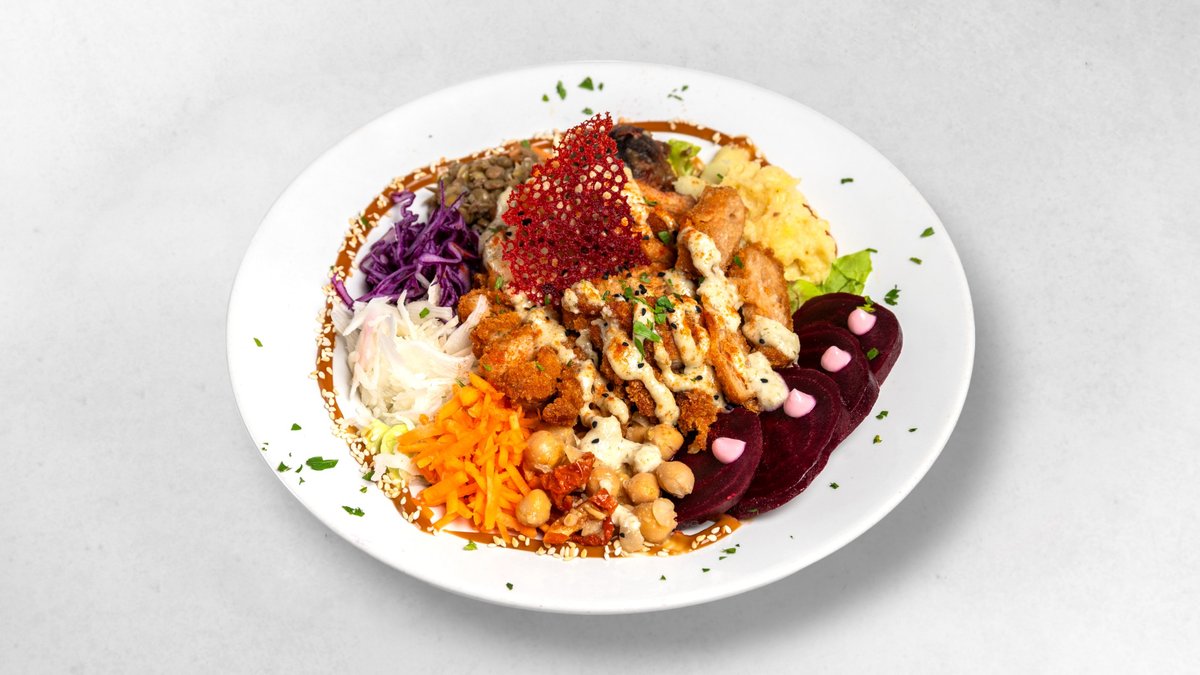 Frittierte Sojastreifen in Pankopanade, Salat, Gemüse, Cashew-Kapern-Soße