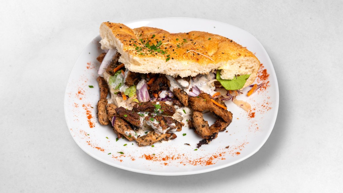 Weißbrot gefüllt, gebratener Sojastreifen-Salat, Gemüse, Joghurt-Knoblauchsoße