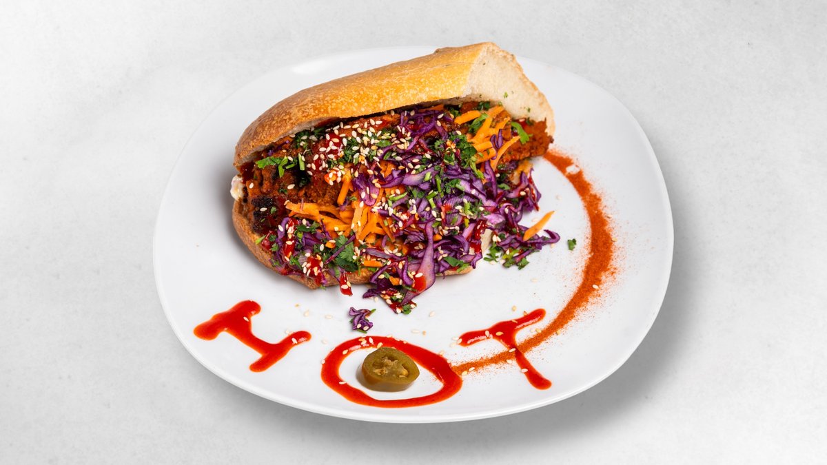 Vietnamesisches Sandwich, Seitanstreifen, Karotten, Koriander, Zwiebeln, Mayonnaise, Chilisoße