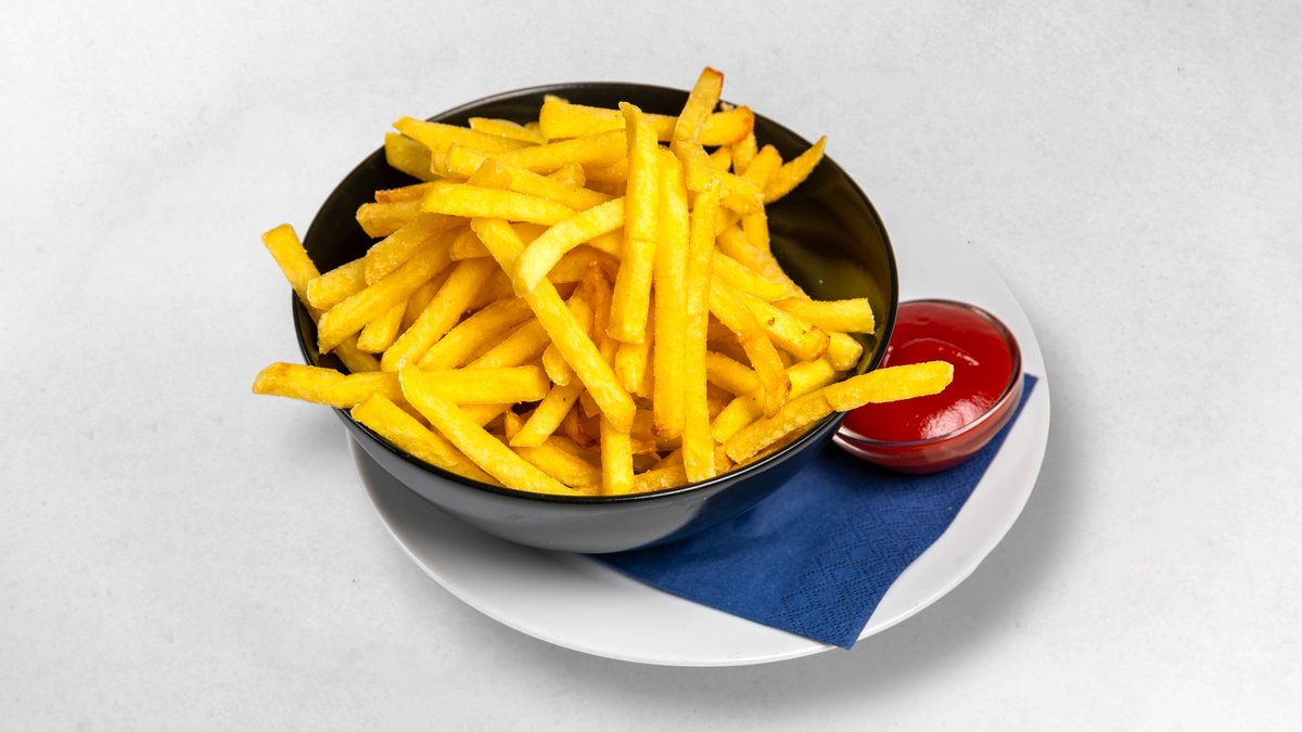 Schnitzel vom Soja, Ketchup, Preiselbeeren, Zitrone, Pommes frites, Salat
