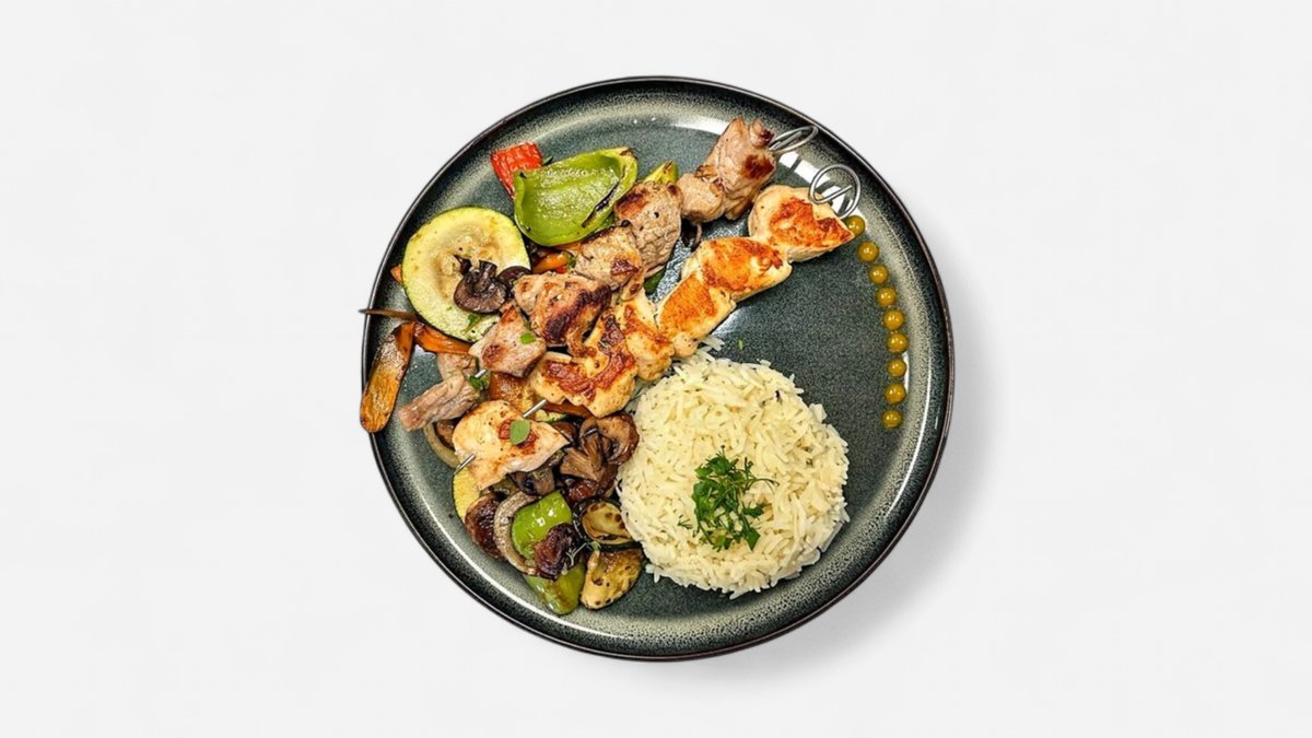 Kalbsspieß & Hühnerspieß mit Grillgemüse und Reis. Herzhaft, saftig, perfekt kombiniert.