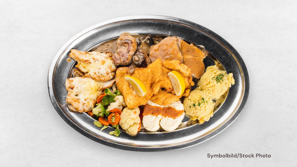 2 Lammspieß, gegrille Huhn,Pommes, Tomaten, Zwiebeln, Petersille-Soße