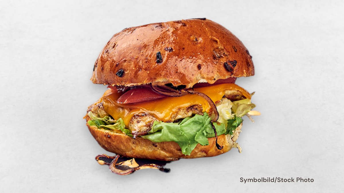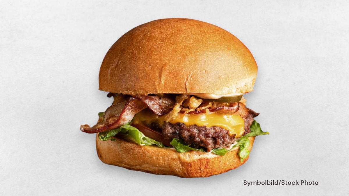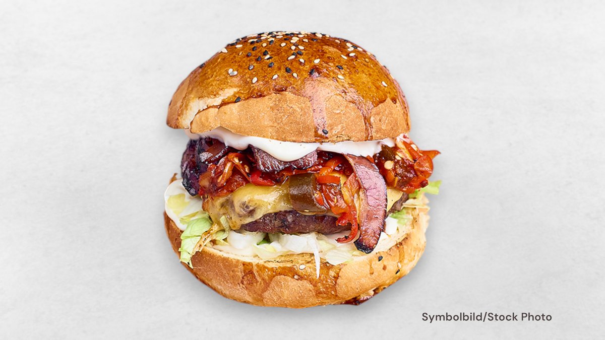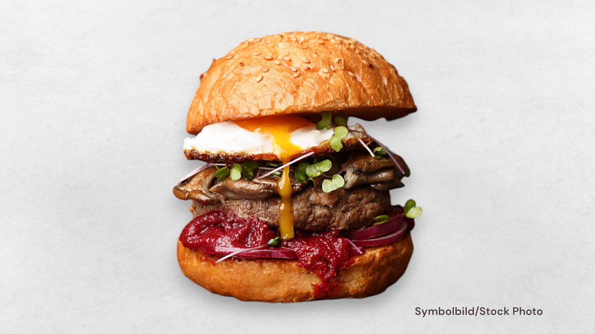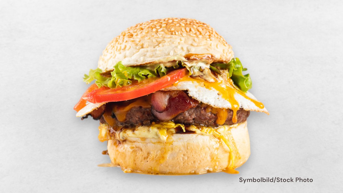 2x Rindfleischpatty, 2x Cheddar, Spiegelei, Tomaten, Champignons, karamelisierte Zwiebeln, Soße