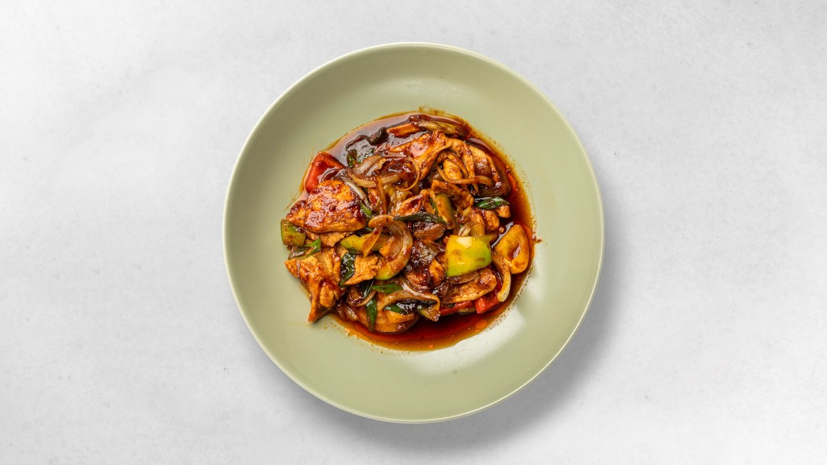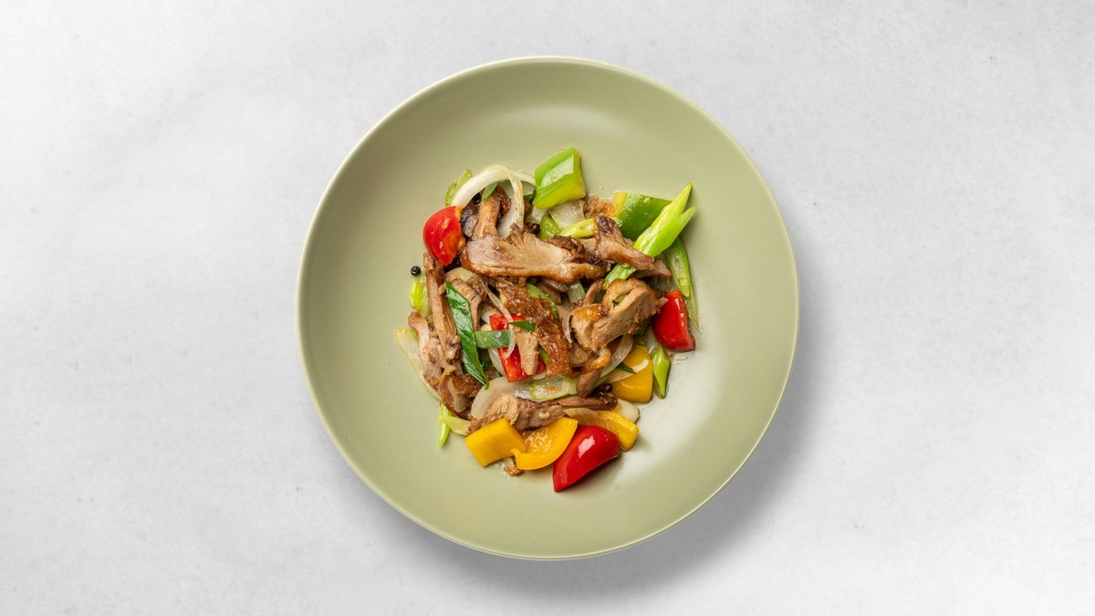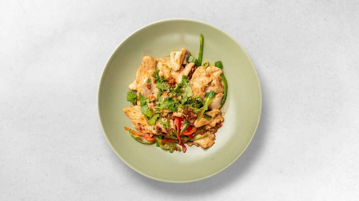 Fried chicken with pepper, garlic, coriander, pointed bell pepper