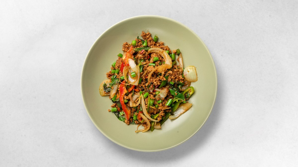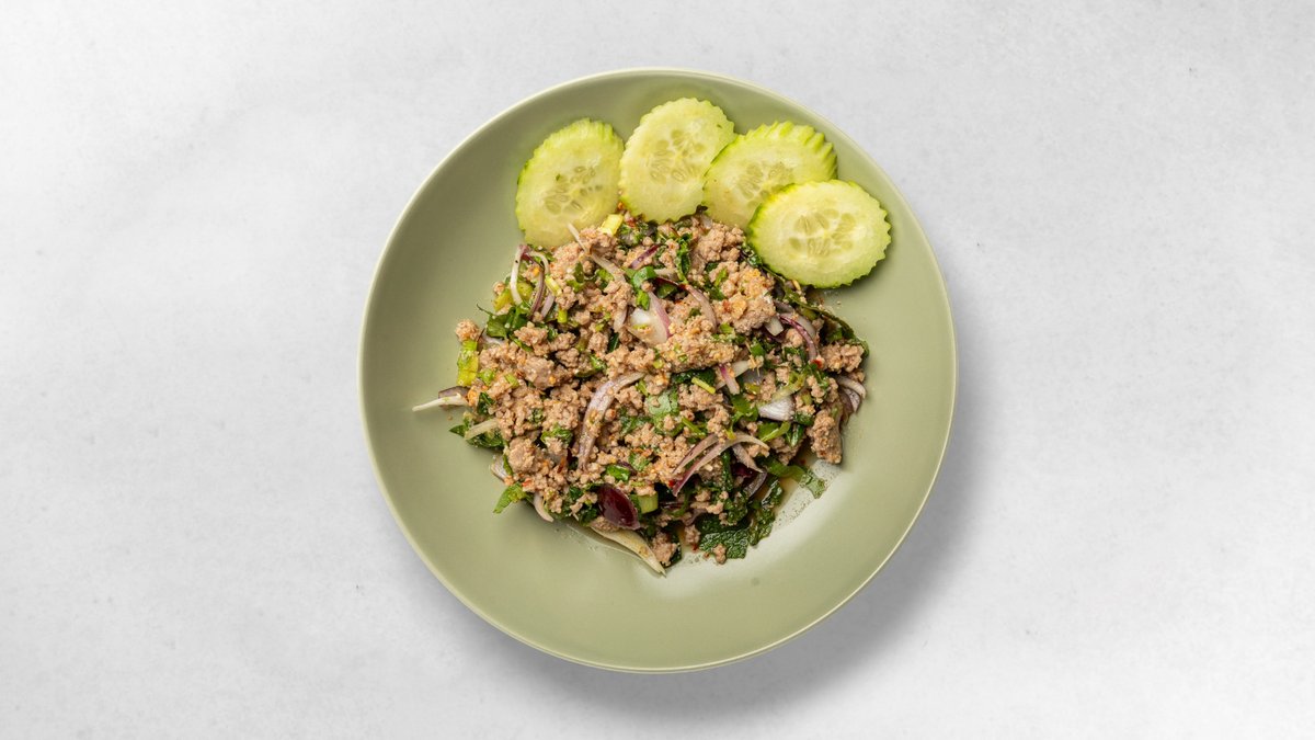 Thai herb salad, minced meat, shallots, mint, green grass, chili powder, roasted rice grains