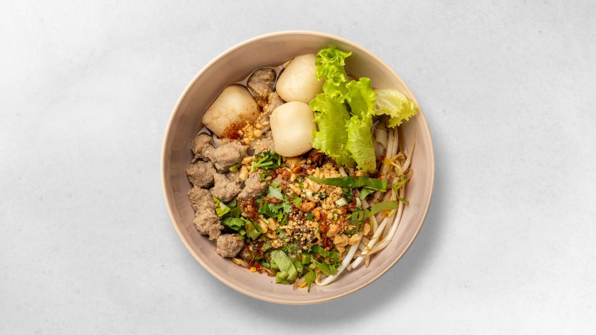 Noodle, minced pork, fish balls, vegetables, clear soup